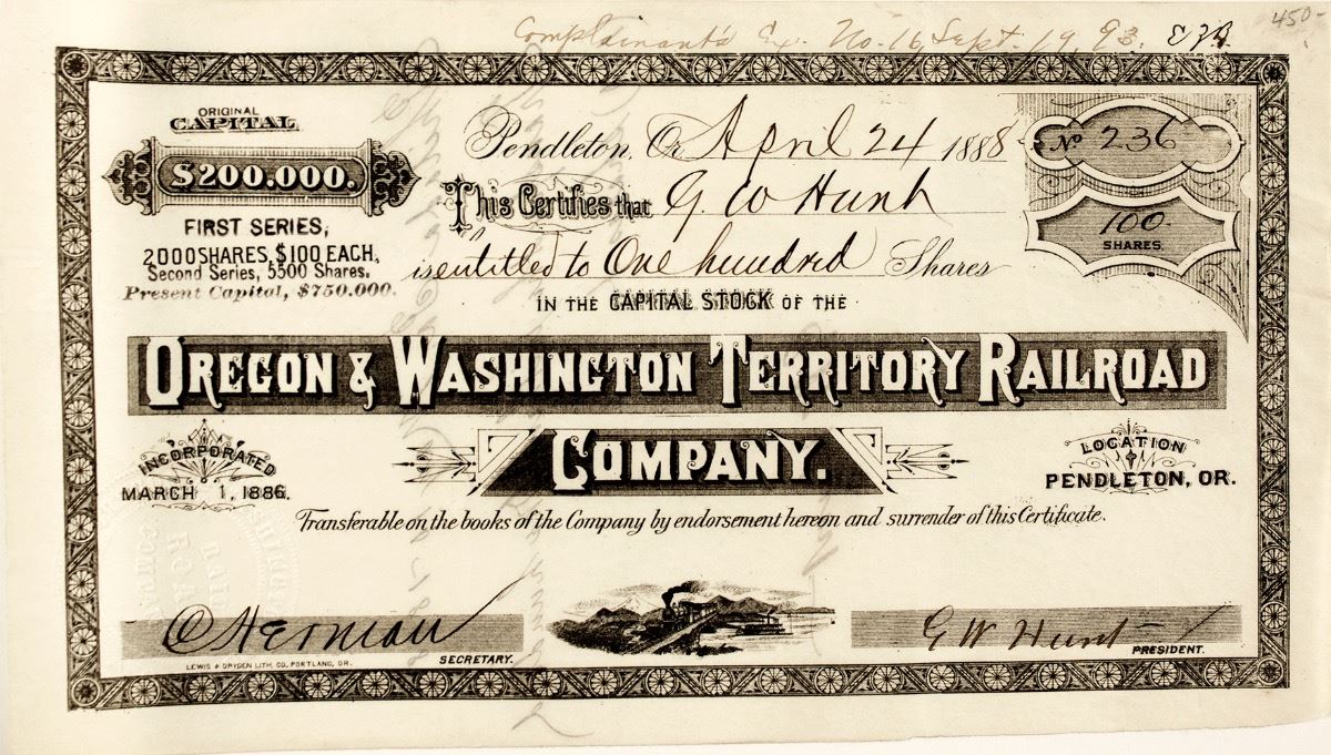 Rare. Inc. 1886. No. 236. Issued for 100 shares to G.W. Hunt on April 24, 1888. Signed by G.W. Hunt as president and C Herman (secretary). Small vignette of locomotive and paddle steamer. Location: Pendleton, Oregon. Pen notations on top. Reverse has pen notations about transfer of shares in May 1888. Lewis & Dryden Lith. Co., Portland, OR. Bottom two corners nicked, otherwise very good condition. Prag Collection City: Pendleton State: Oregon Date: hwac# 22626