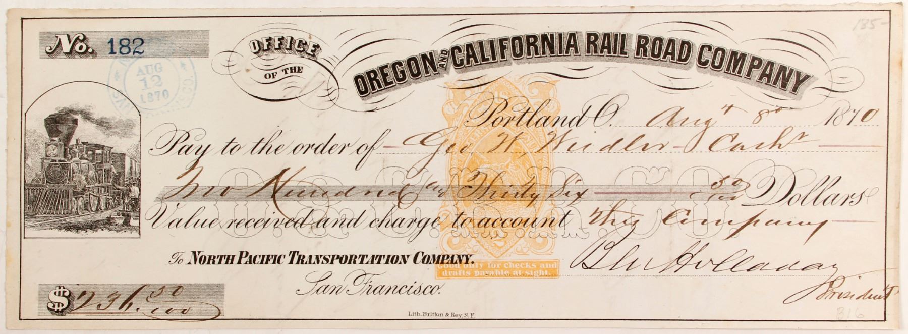 Check # 182 Portland, OR signed by Ben Holladay, orange underprint. Train vignette. Prag Collection. State: City: Date: 1870 HWAC# 83215