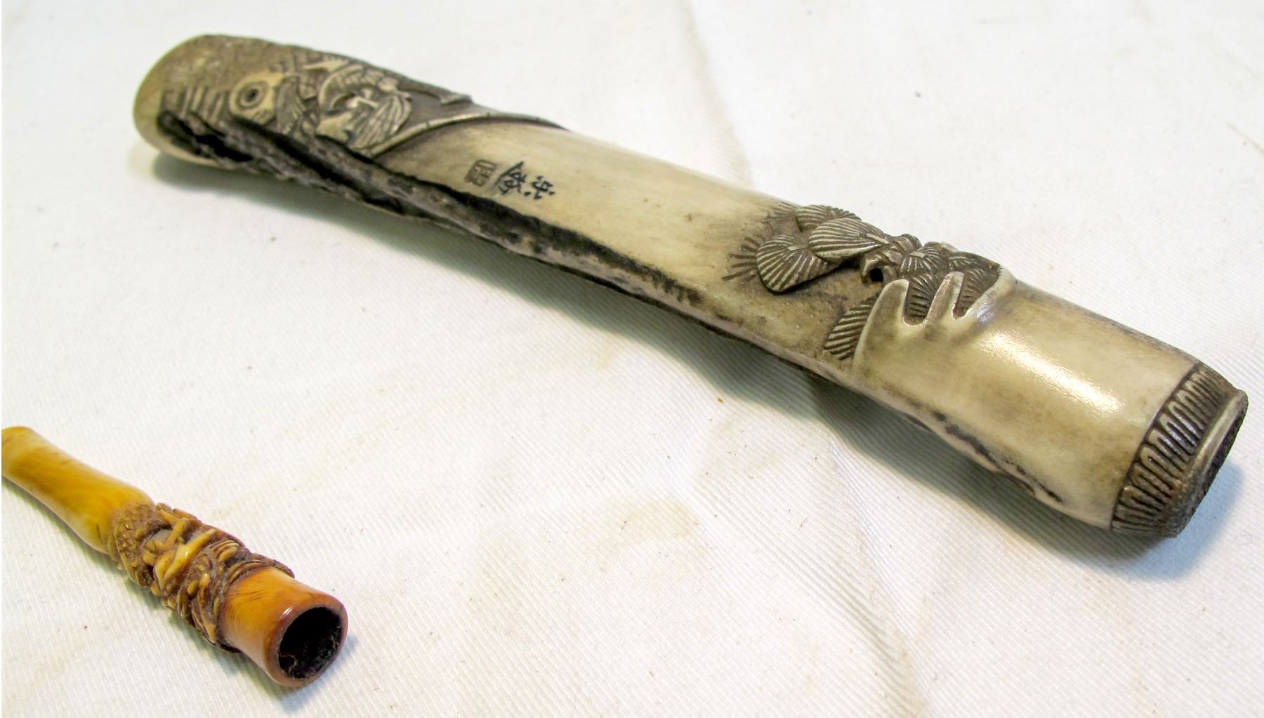 7.5" long, signed ornately carved bone with shells and human figure. Comes with carved bone cigarette holder. Date unknown, but appears very old. State: City: Date: HWAC# 84843
