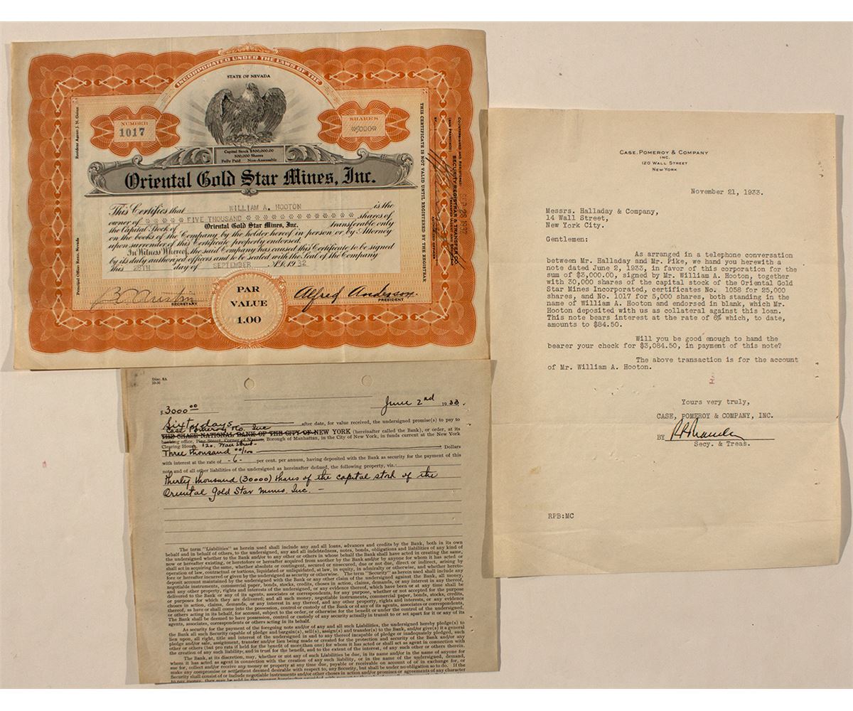 Typewritten letter from one Wall Street firm to another asking for payment with enclosed stock certificate in the gold mine from Alleghany in Sierra County. The Alleghany region was the only California gold mining district still producing into the 1960s.