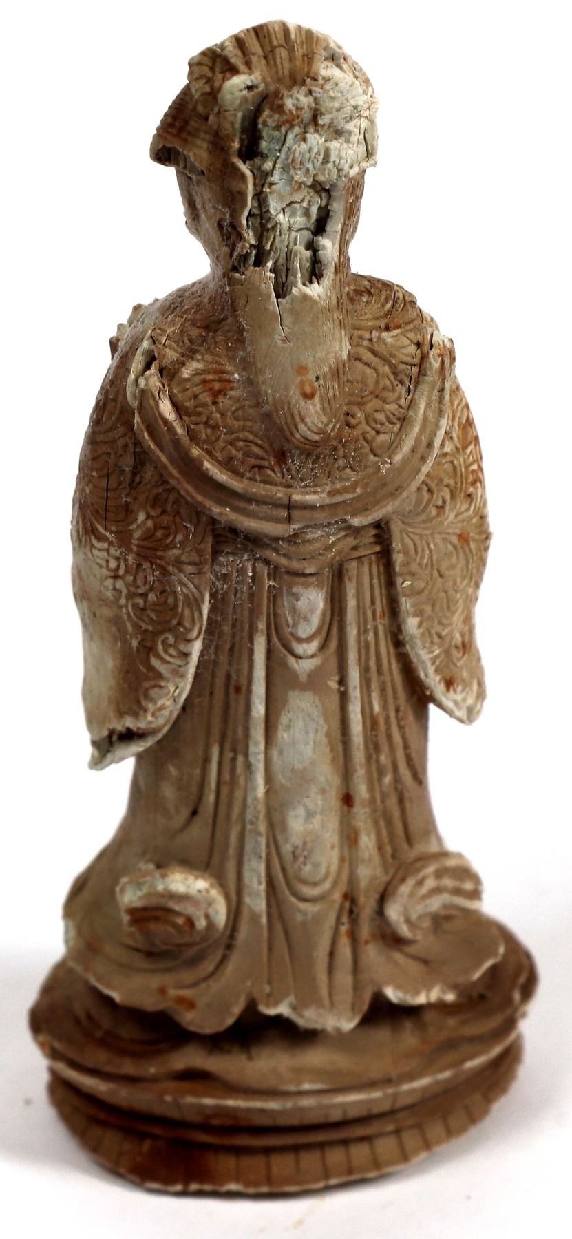 Oriental human figurine recovered in 2014 from the S.S. Central America shipwreck. Oxidized ivory, classic ivory texture visible on the base, 4" tall on a 1.5" oval base. Ivory degrading, some chips, overall, still solid and appears stable. A 2014 recovery, it has been out of water for eight years. This is one of a very few Oriental-themed items recovered from the shipwreck. Another was within the Easton trunk. Interestingly, the S.S. George Law (the original name of this ship) carried the documents for the Treaty of Kanagawa between Japan and the USA in 1855.