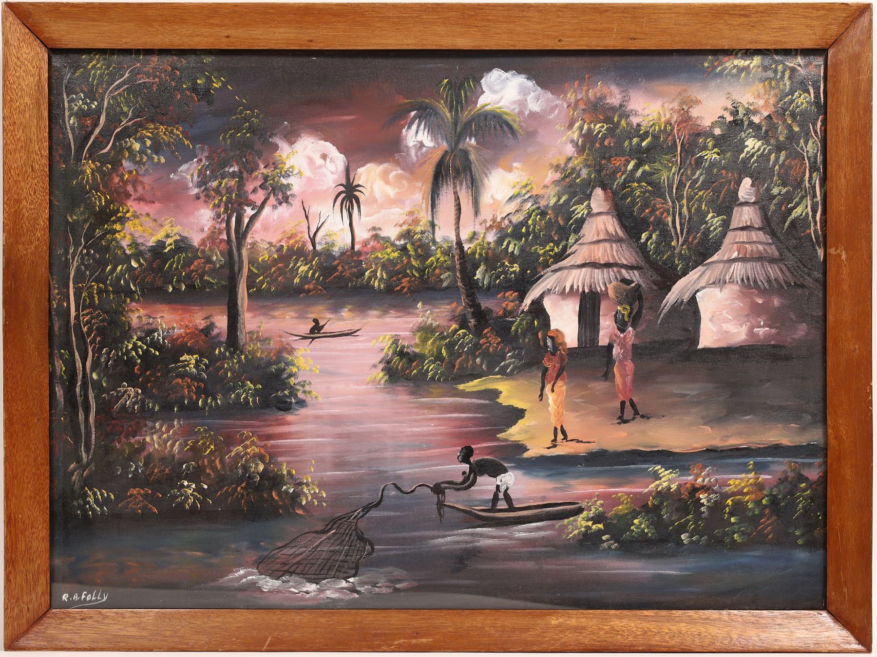 2 Framed Original Oil Paintings under glass. 23 x 30.5" with wood frames. Signed "R. A. Folly" at bottom left. Both scenes of African coastal village, one during the day and the other at night. Beautiful, vibrant colors.