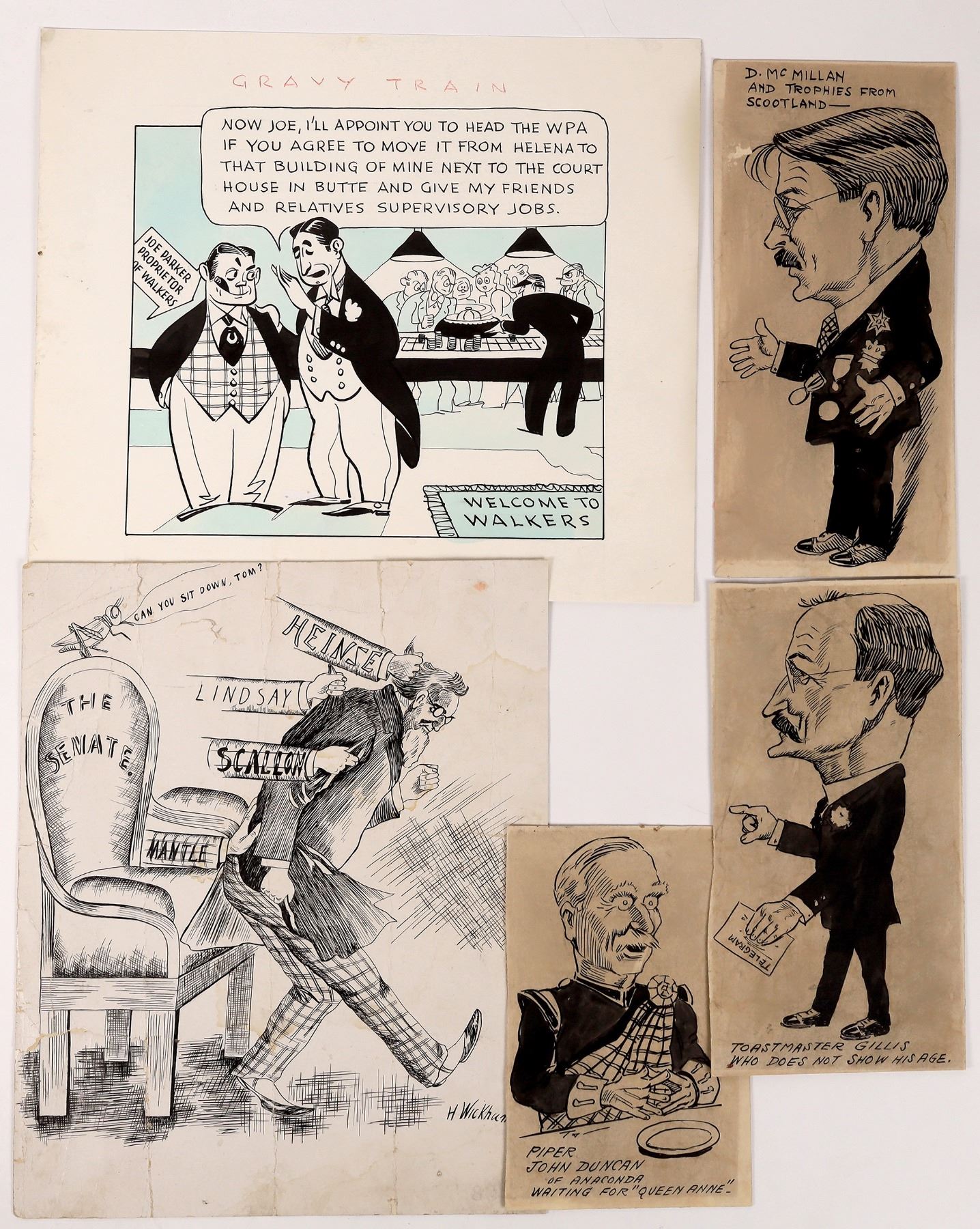5 original art Montana political caricatures. D. McMillan, Piper John Duncan, Toastmaster Gillis, color Joe Parker, Can You Sit Down, Tom?-perforation, crease, stain. 7x4.5" to 1.75x12.5".
