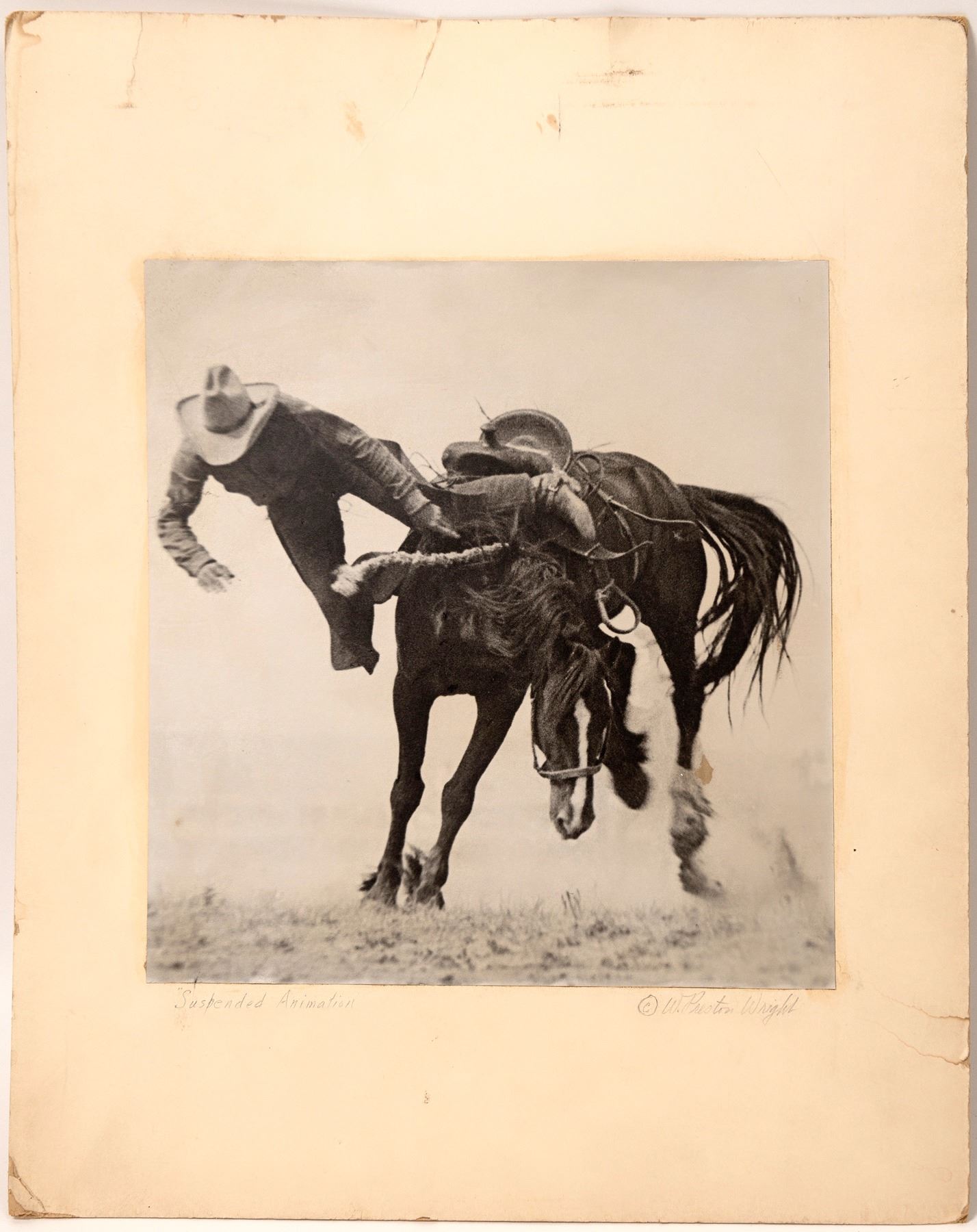 This is an original photo print of a cowboy falling off of a bucking horse titled, "Suspended Animation." The photographer was W. Preston Wright, from Great Falls, Montana. His original label is on the back of this piece, and it reads, "W. Preston Wright/ Box 764/ Great Falls/ Montana." This print is signed by the photographer in the lower right corner. The print itself is in good condition, with only a few minor stains. The backing has several stains and tears. Approx. 16 x 20 inches.