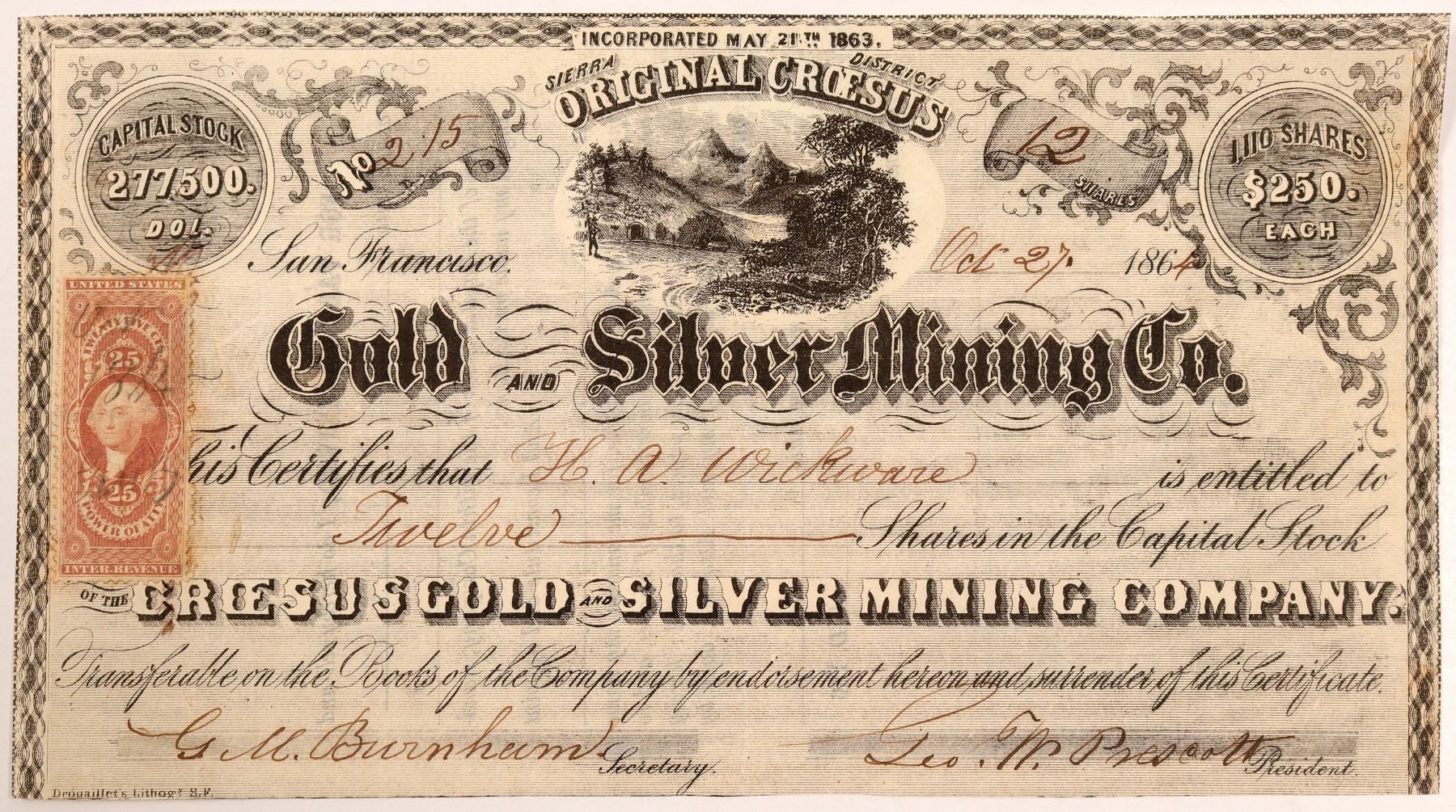 # 215 for 12 shares to HA Wickware. Signed by GM Burnham and president George Prescott. Dateline San Francisco October 17, 1864. Incorporated May 21, 1863. 25c Power of Att'y revenue stamp. Miner on his way to work vignette. Drouaillet lithographer. Trimmed. Small hole upper right. In Humboldt County in 1863; now in Pershing County. Largest mining camp in the area was Dun Glen. The district was located at the northern end of the East Range, [Mining Districts of Nevada by Tingley] This certificate was issued 4 days before statehood. Ken Prag Collection