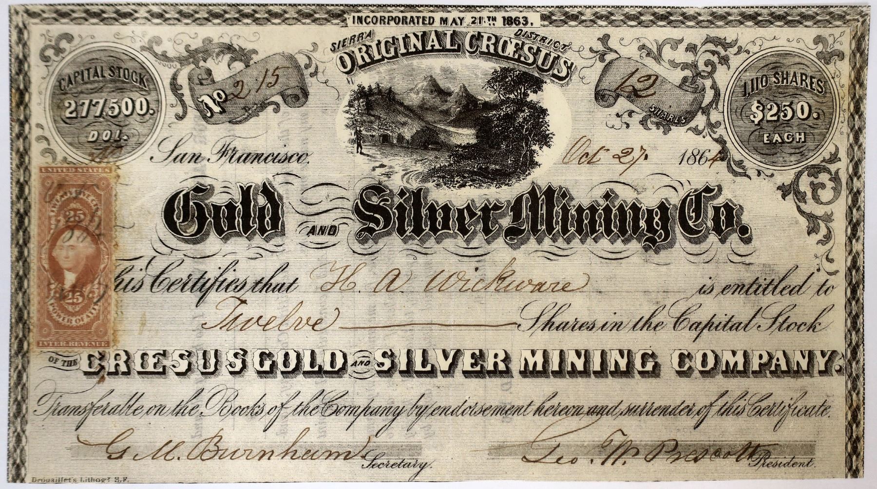 # 215 for 12 shares to H. A. Wickware. Signed by secretary G. M. Burnham and president George Prescott. Dateline San Francisco, October 17, 1864. Incorporated May 21, 1863. 25c Power of Att'y revenue stamp. Miner on his way to work vignette. Drouaillet lithographer. Trimmed. Small hole upper right. Printed above name "Sierra District." In Humboldt County in 1863; now in Pershing County. The Badger and Croesus ledges were the best. "Specimens from the Croesus are spangled all over with course gold,"[Sacramento Daily Union, April 20, 1863.] By 1864 one did not find great expectations but assessments and delinquent notices. This certificate was issued 4 days before statehood.