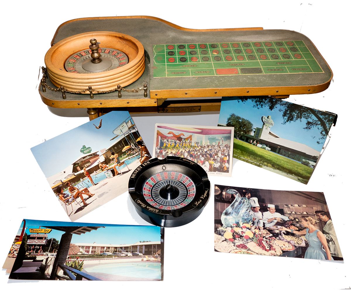 Very rare. Given out opening day, April 24, 1950. Measures approx. 6.25" 17.75" x 10.25." Plaque on base reads: "Wilbur Clark's/ Desert Inn/ Las Vegas, Nevada/ Patent Appld For" Wear to table, small chips to paint on numbers. Also included are seven Desert Inn postcards, 6 of which are postally unused. The Desert Inn was the fifth resort to open on the Las Vegas strip. Wilbur Clark originally started the construction on the resort but ran out of money. The Cleveland mob stepped in, though Clark remained the public figurehead.