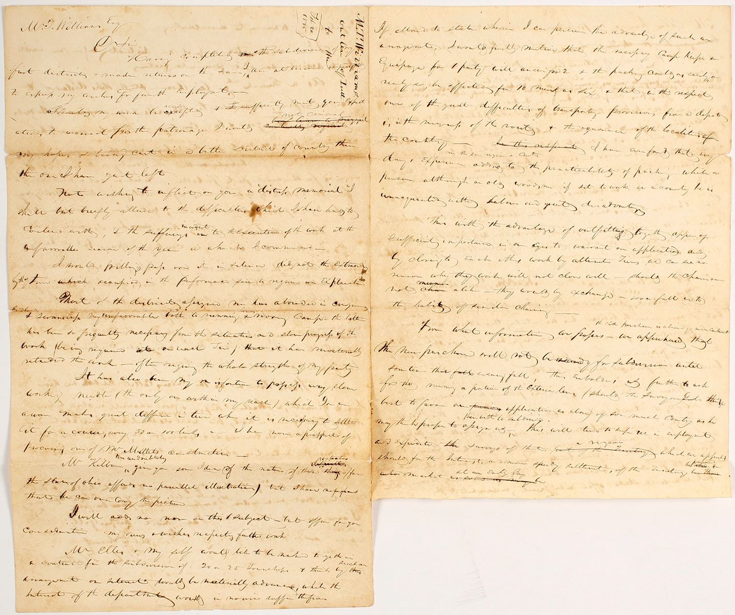 Four page letter on legal sized paper to W. T. Williams dated February 20, 1835. Difficult to read, but we can give you a glimpse as to what is inside. "The state of Ohio affords no parallel illustration", "Mr. Ellis and myself would like to get in such a contract for the subdivision of 20 or 25 townships", No instructions of the subdivision of Grand Cacilin Rapids (now called Kaukauna, Wisconsin) received, "Wood RIver, or as the Indians call it, Kewahne RIver. As you can tell this is an exploration party in the Wisconsin / Ohio area and it is a report back to W. T. Williams. Fantastic content! Just needs someone to take the time to read it and figure out which expedition it was from. Date: 1835 Location: Wisconsin HWAC# 59721