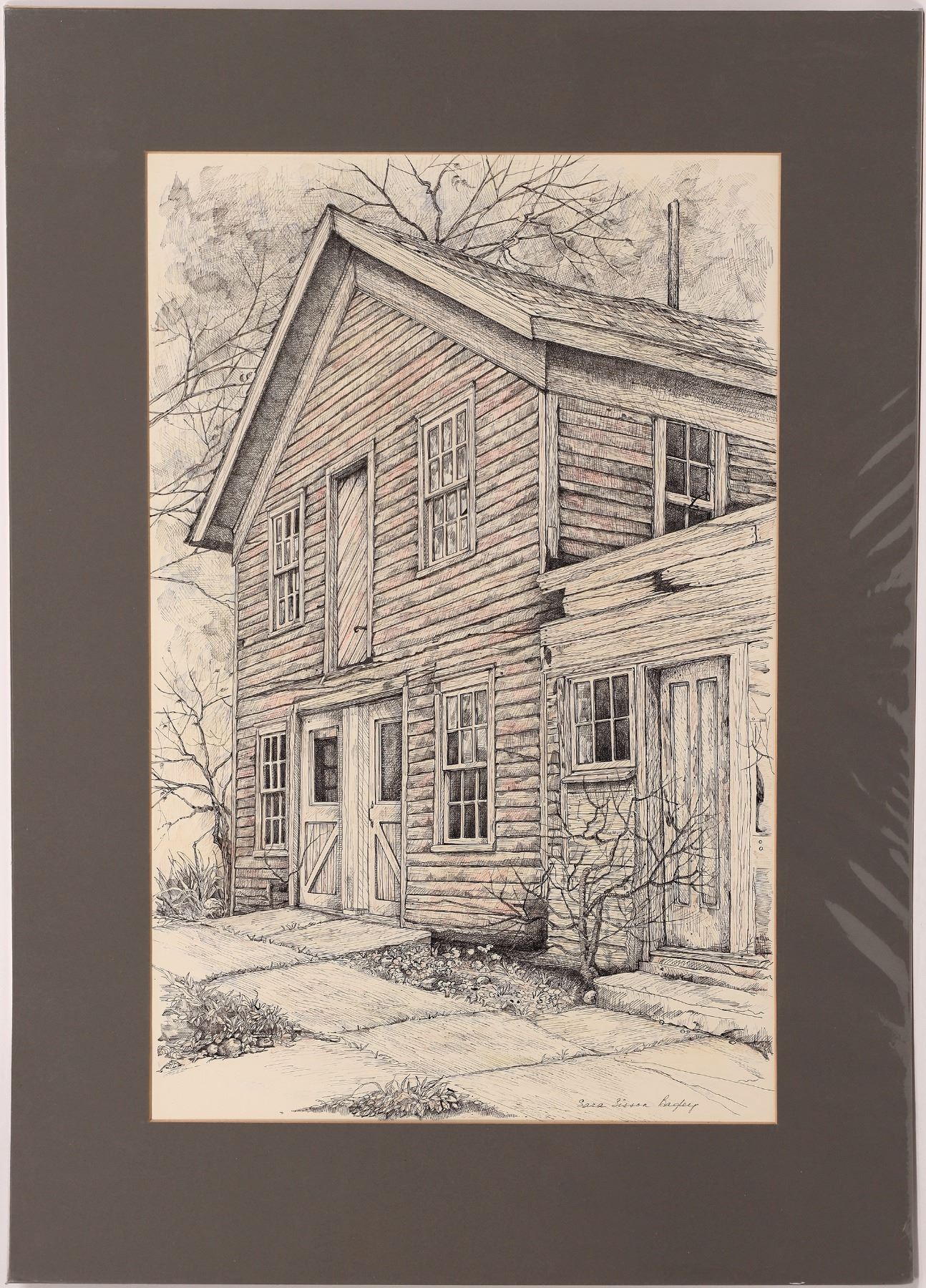 Original pen and ink drawing by Sara Sisson Bagley, an artist from Michigan. This drawing depicts a wooden house with some barren trees and shrubbery around it. The handwritten caption on the back reads, "Fishers Pride' [?], Sara Sisson Bagley, 122 Harrison, Coldwater, MI." The drawing is also signed by the artist in the lower righthand corner. The drawing is mostly done in black ink, but there are some spots with red ink as well. The drawing is 21 x 13.5, matted with a grey border that makes the overall size 27.5 x 19.5. Very good condition, the drawing is protected by a plastic cover.