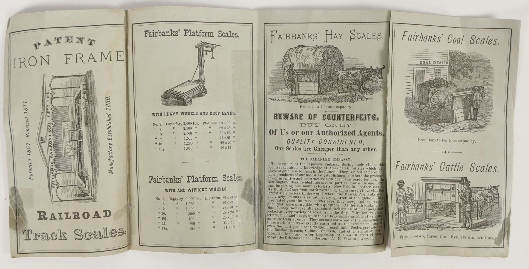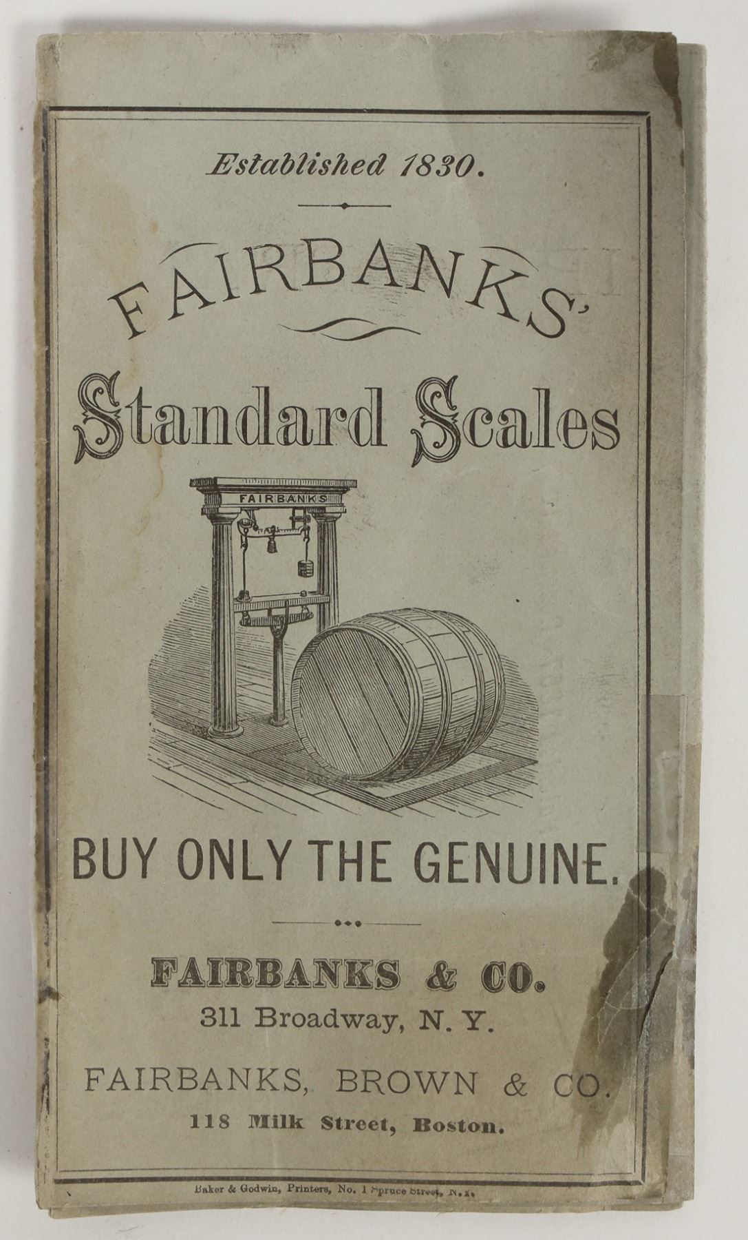 Original Promo paper booklet, Fairbanks Standard Scales. "Buy Only The Genuine" established in 1830 reads the cover. Fairbanks & Co. of New York, and Fairbanks, Brown & Co. of Boston. Inside pages reveal scales for coal, cattle, hay, warehouse scales, iron or wheelbarrow scales also. paper is stained on outer edge, minor repairs and mainly intact in its fold-out pattern. Measures approx. 5.5"x3". Unique and original, please inspect.