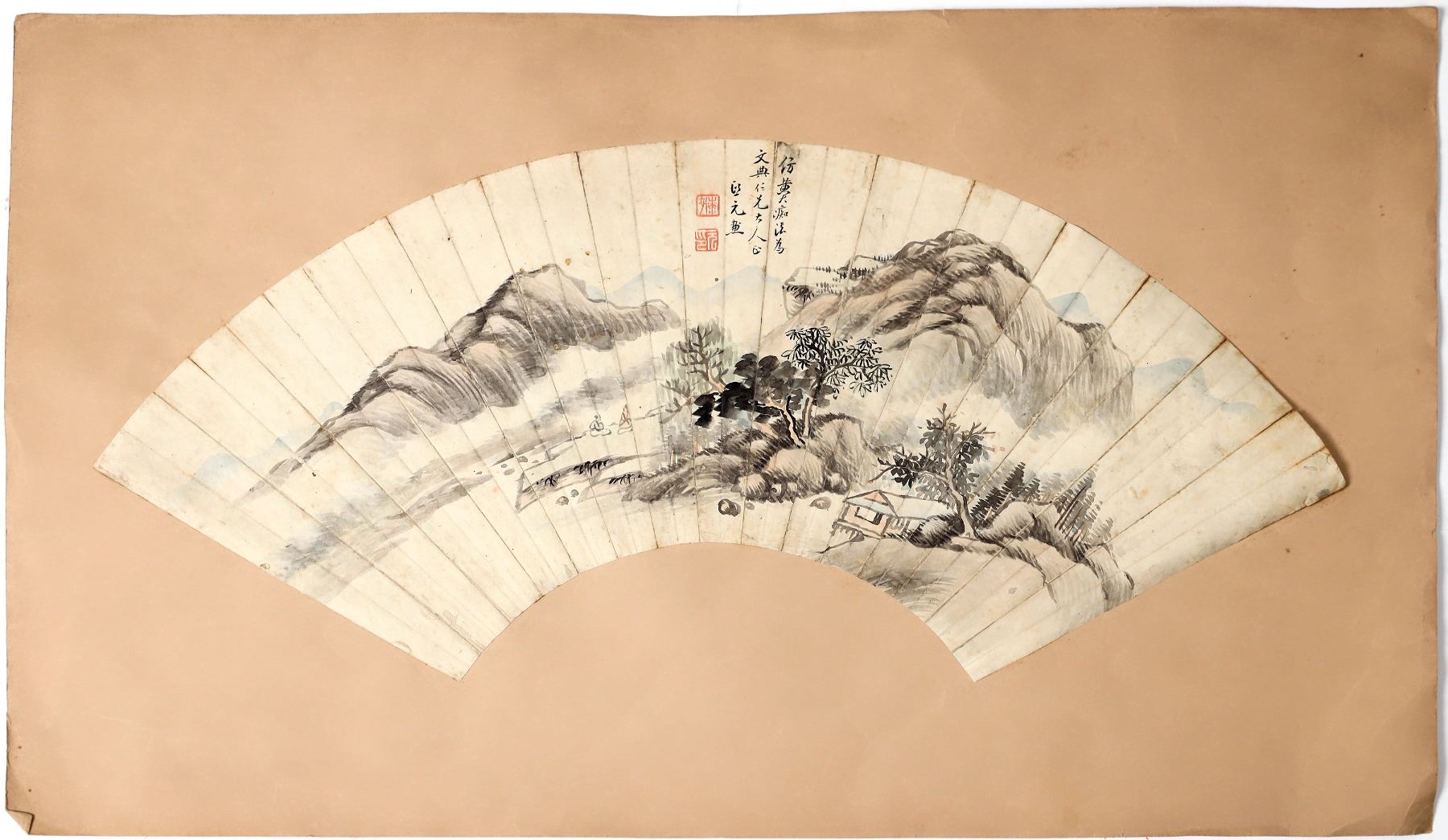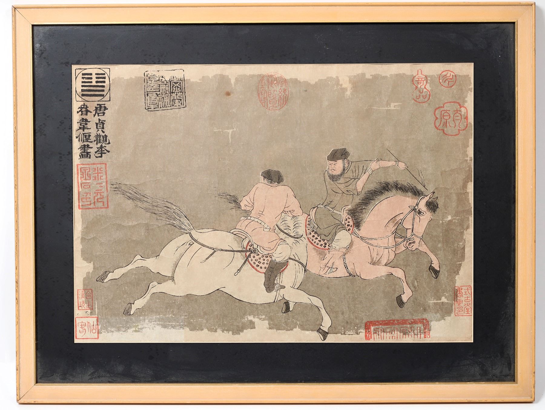 Mounted fan style art with village scene, 2 red stamps, 20x9". Original framed scene of 2 men on horses. 9 red and 3 black stamps, 13.5x19.5", frame 19.5x25.5".