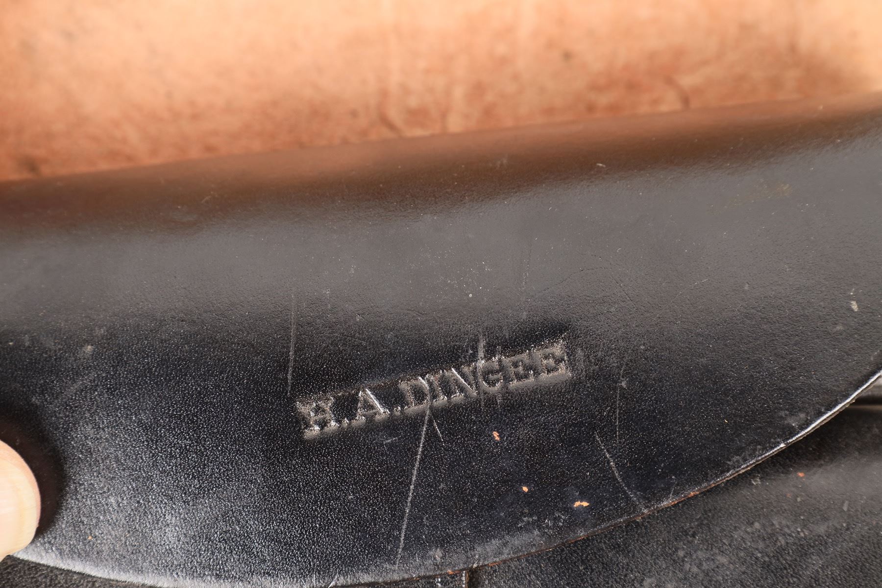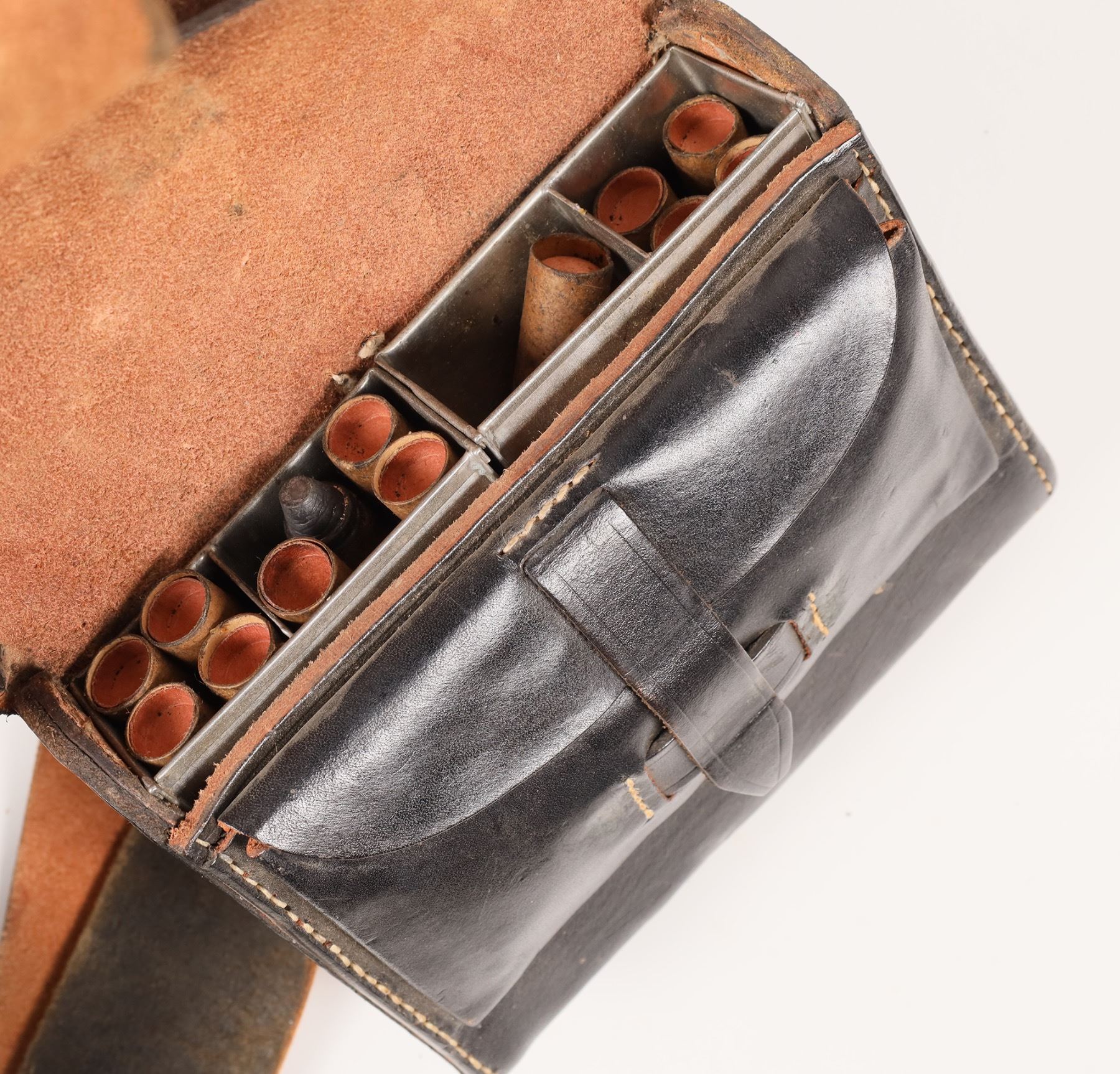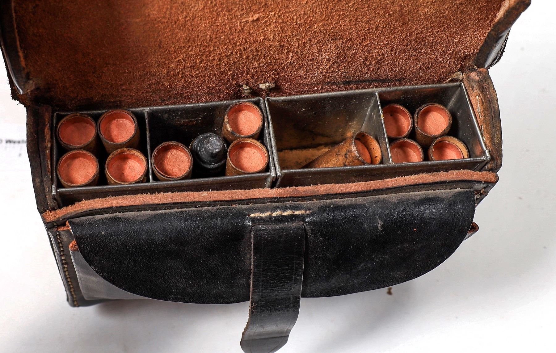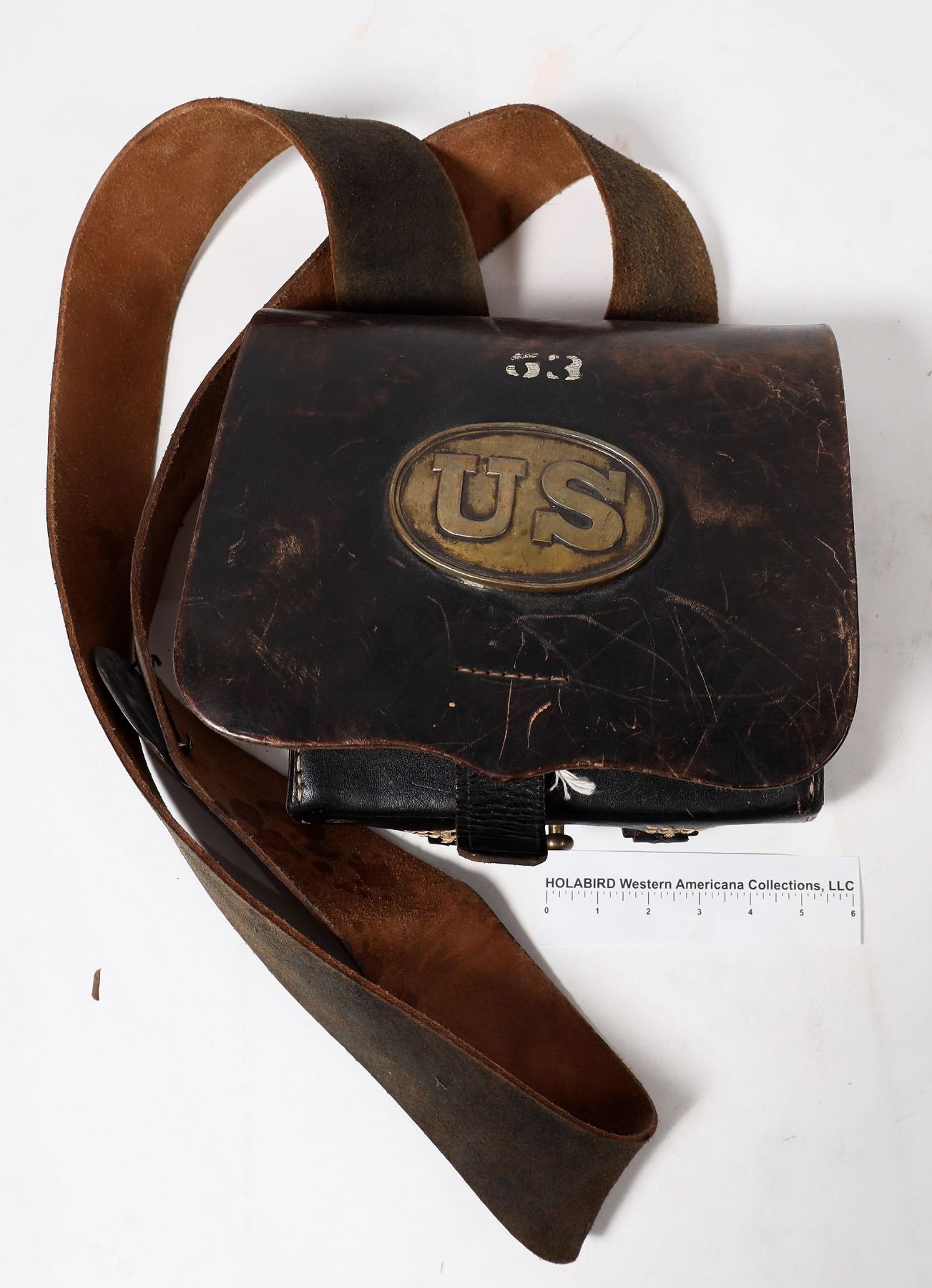 This Dingee cartridge box is an original from Richmond, Virginia 1865. It is filled with paper cartridges (for an unknown musket), in excellent condition. It served at the 125th Anniversary of the Battle of Saylor's Creek and the Stacking of Arms at Appomattox Court House April 6-8, 1990 by a reenactor. The box carries the standard issue US oval in brass badge on the top flap but also carries an original eagle badge from the "the Crater". All together in excellent condition. Because of the ammunition included, special has-mat shipping charges apply. Ground shipping only. No sales to New York, New Jersey, California, and Hawaii.