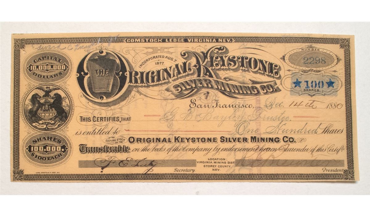 100 shares of stock in the Original Keystone Mine which was part of the mining frenzy of the Comstock. Unusual vignette on left of two horses and motto Liberty, Virtue, Independence.
