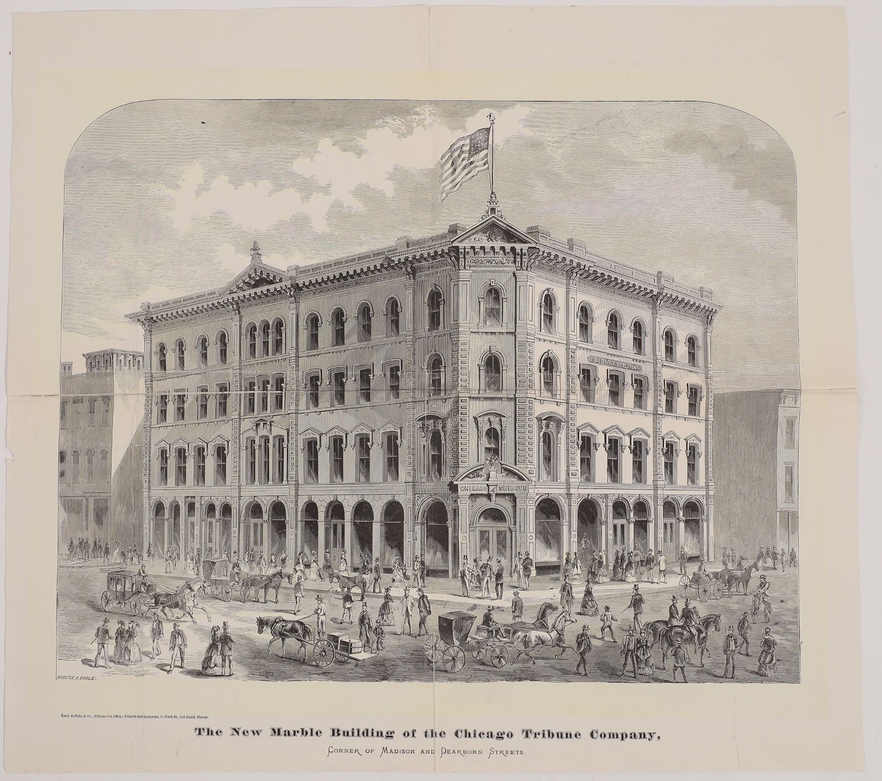 Original folded litho of the New Marble Building of the Chicago Tribune. Built in 1869 this building featured beautiful architecture with steam radiators. The Great Fire of 1871 marked the end of the building. 17x17". 2.25" top center tear, some edge issues, verso tape repairs.
