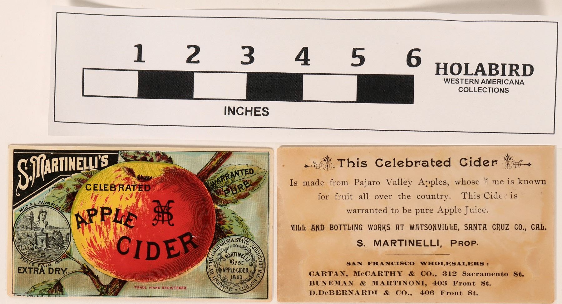 Wow! Original S. Martinelli's advertising trading card, c1890. Colorful lithograph with red apple on green background, with vignettes of medal awarded at the CA State Fair, 1890, and The California State Agricultural Society Award, 1890. Printed by Schmidt, Larel & Lith Co., S.F. Measures approximately 3 x 5 inches, with description, company address and San Francisco wholesalers' addresses on the back.