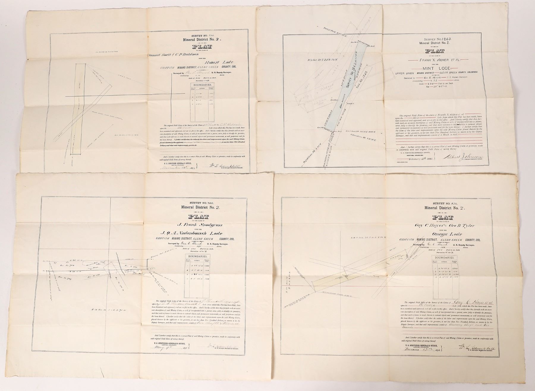 4 original patent plats, Griffith Mining District, Clear Creek county, Colorado. "In 1859 George and David Griffith found gold in the Georgetown valley. The Griffith mining district was officially established on June 25, 1860. Silver and gold were found, many claims were staked on excellent ore but, it was a pesky kind of ore that did not give up its gold or silver easily. It took several decades and repeated tries until metallurgic science got it right." from capitalprizegoldmine.com. These are the original 1878 patent papers from the government. They show locations of shafts and all pertinent survey info. Signed by Wm. L Campbell or Albert Johnson, US Surveyor General for Colorado. Hobart Lode, Mint Lode-several tears on creases, Omega Lode-tear, J Q A Nadenbousch Lode. 15.5x20". Please inspect. Clear Creek County Colorado