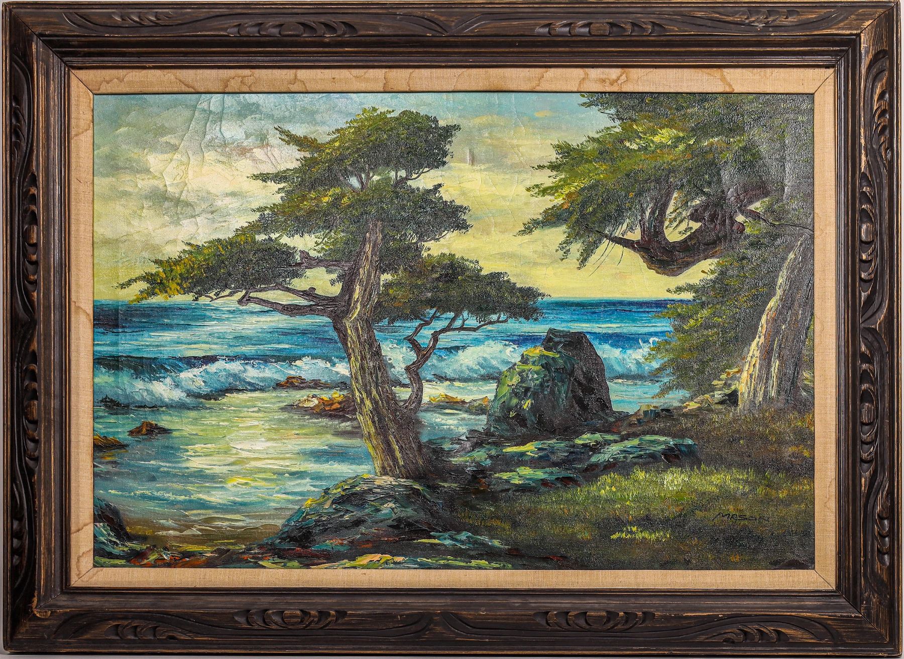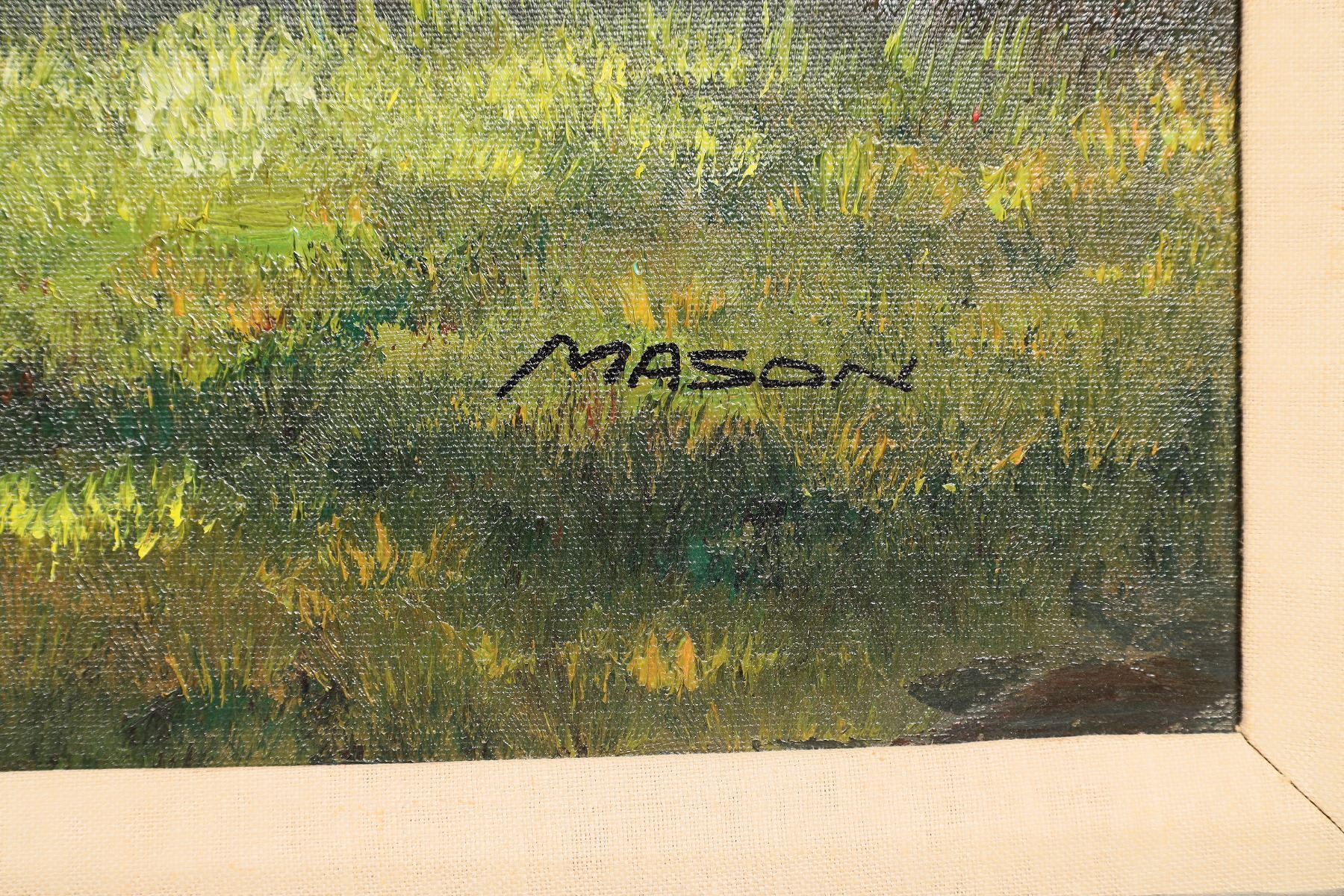 Beautifully painted oil on canvas by Mason (signed Mason). We have not been successful in finding info about the painter. Vivid colors of a California central coastal area. Ornate vintage wood hand made custom frame, 44" x 32", Linen over mat has water damage. 2 small dents in canvas only visible on reverse. Actual painting, 36" x 24".