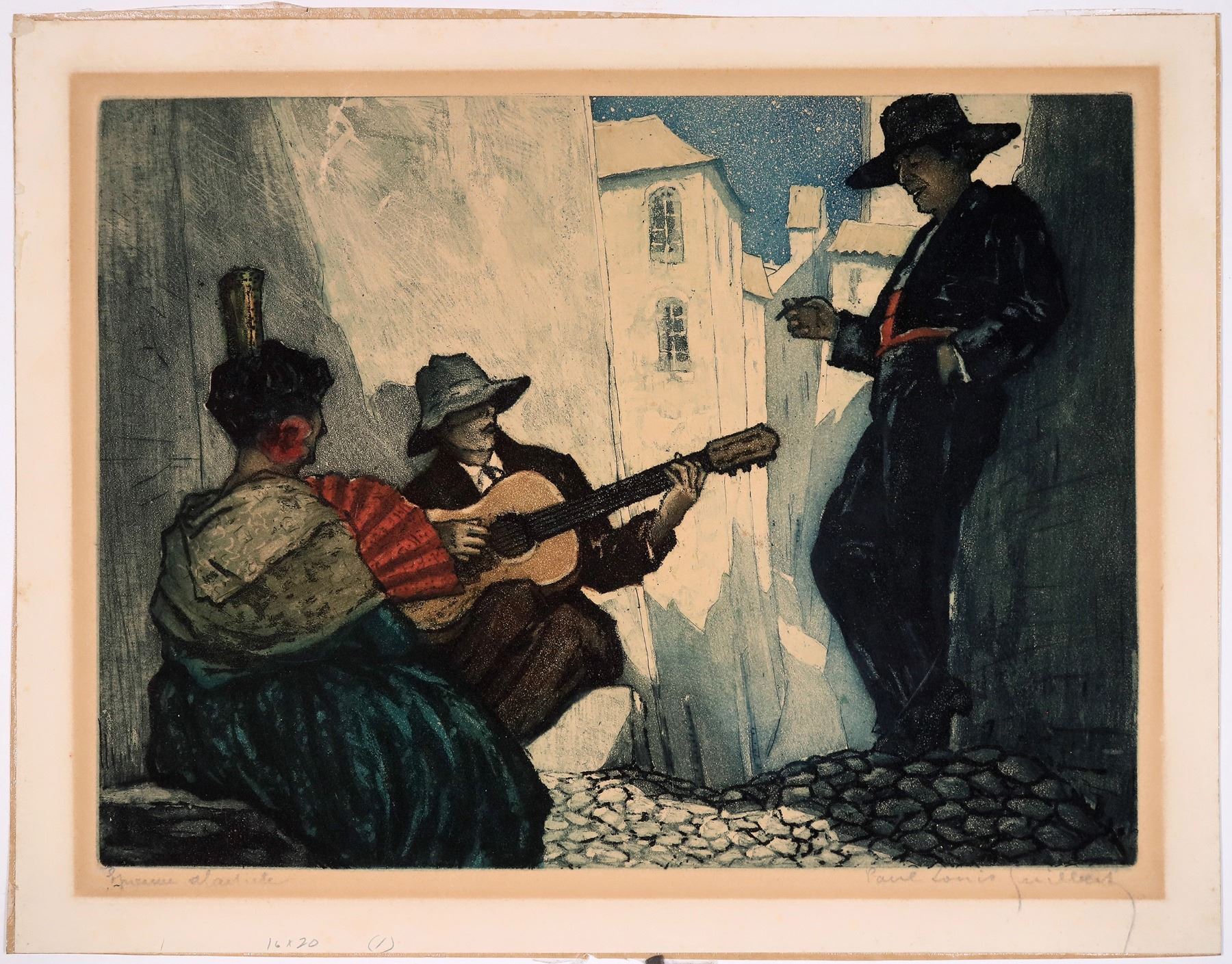 Original hand colored print by French artist Paul Louis Guilbert, 1886-1952, of 3 Spaniards in an alley listening to guitar music. Signed by artist in lower right. 16x20".