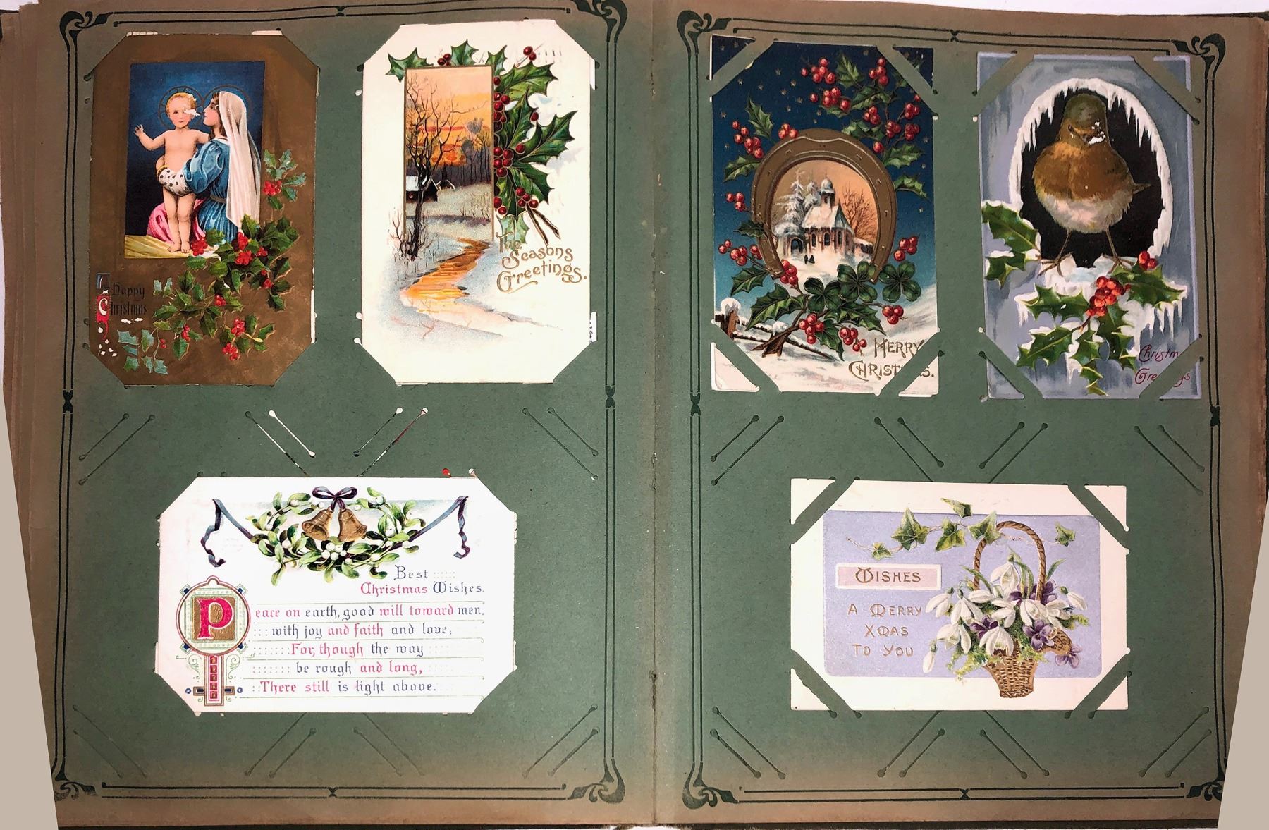 Approx. 133 cards. About 1/3 of the cards are generally California locations (Mitchell etc. ) and the other 2/3 are holiday related cards. Original, embossed, padded album. 13" x 10"