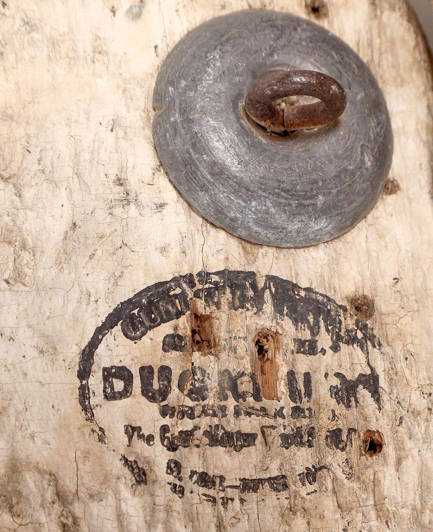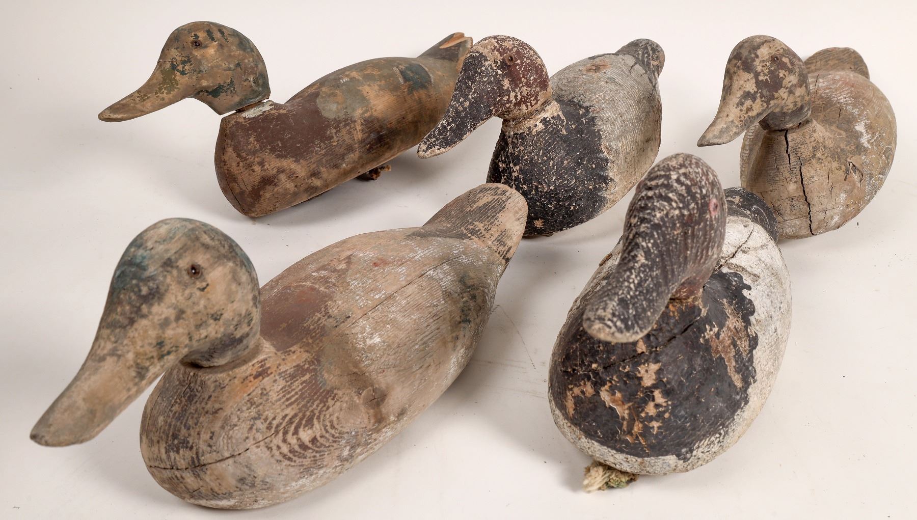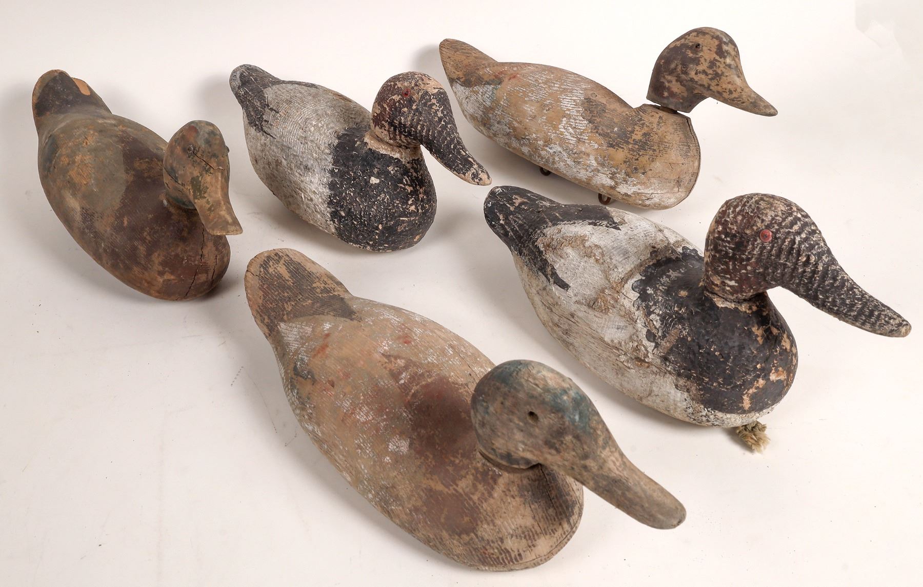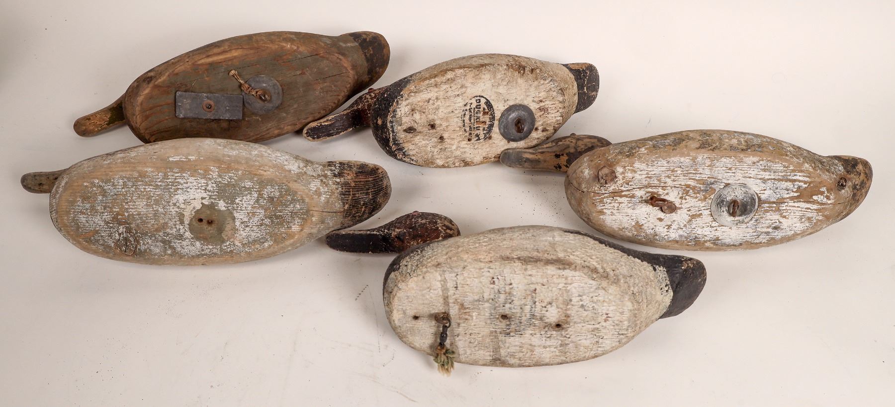 5 original wooden duck decoys that were used on Butte-de-Morts Lake in WI. (near Oshkosh). c. 1900-30. About 6.5x14", heavily used. Two of the decoys are Canvasbacks with original paint and an oval painted stamp of the (now-illegible) makers mark and glass eyes. Several of the decs' have round metal plates attached by a screw-eye. Please see photos for details. Wisconsin