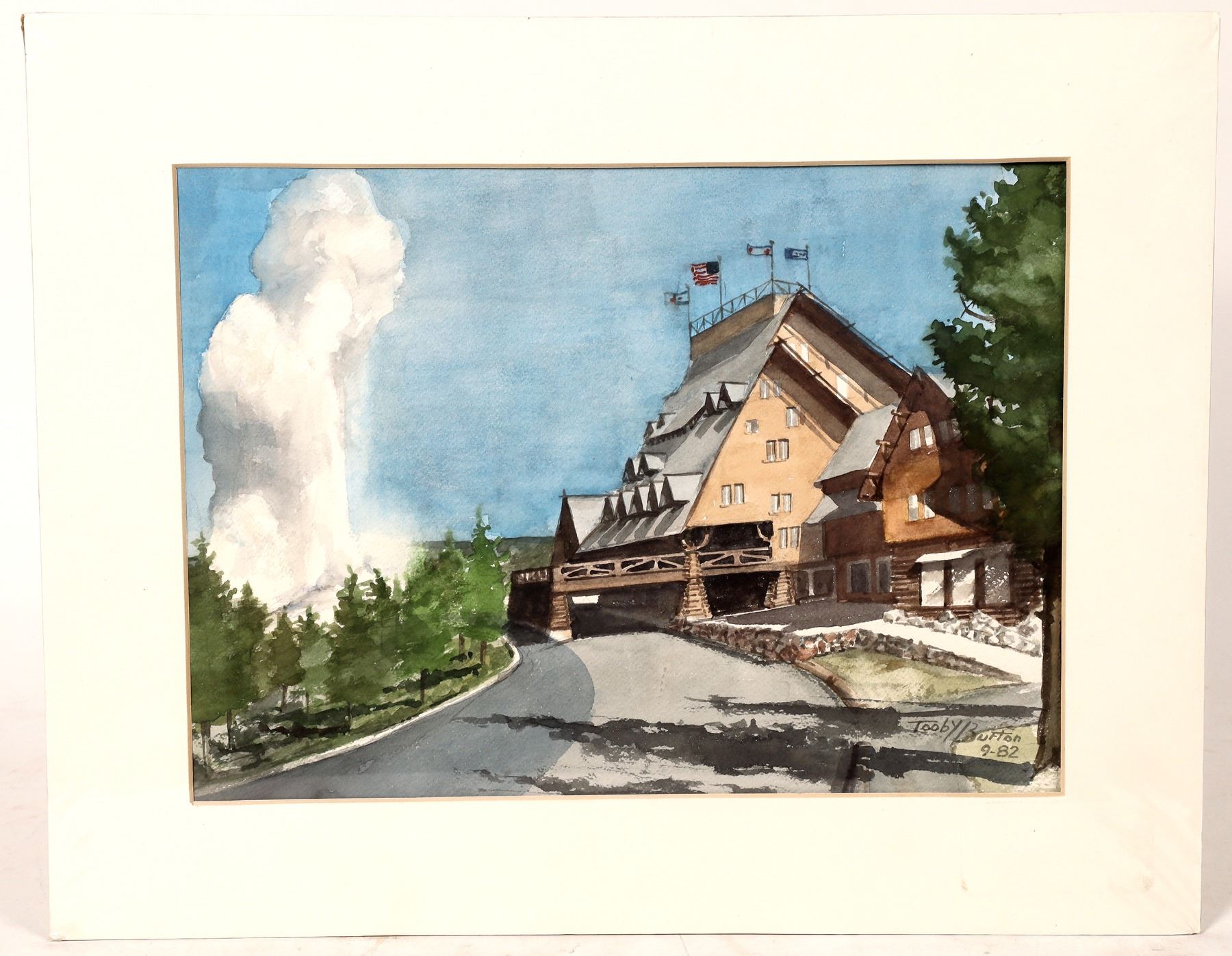 Original watercolor painting by Tooby Burton, 9-82 of Old Faithful Inn with a billowing steam cloud from the eruption on the left. Burton was the artist in residence at Old Faithful Inn for much of the 1980's. 9.75x13.5". FOR MORE ORIGINAL ARTWORK LOOK FOR OUR DECEMBER LIVE AUCTION COMING UP THE 7TH - 10TH! Yellowstone Wyoming
