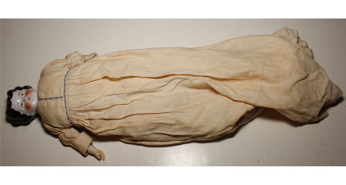 Porcelain head is in excellent condition. One leg is broken and stuffing is coming out. Date: c1900 hwac 20418