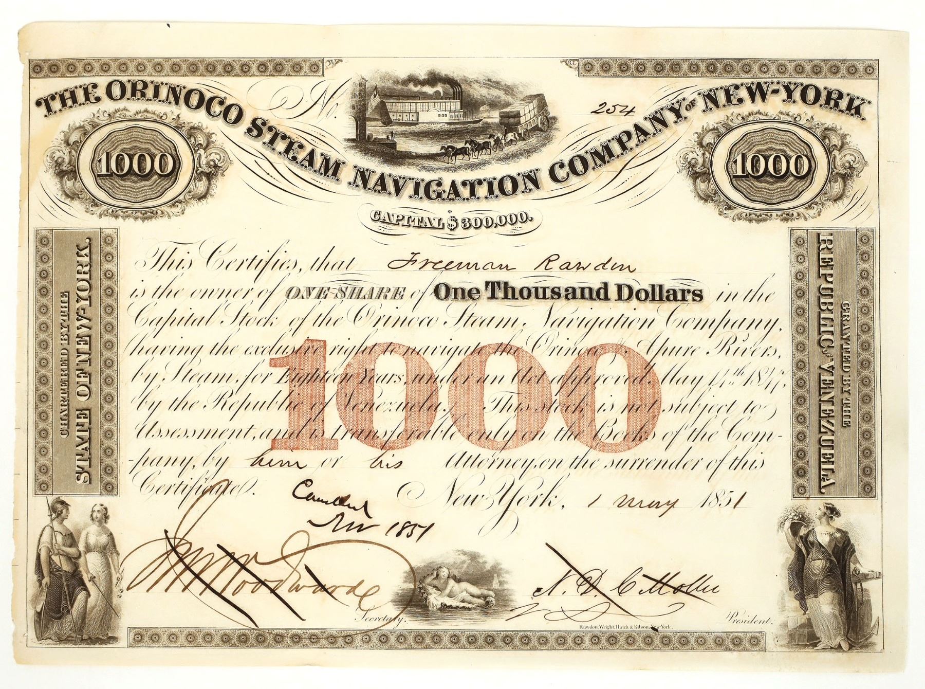 1852 Orinoco Steam Navigation of New York stock. One $1000 share. Steamer vignette.
