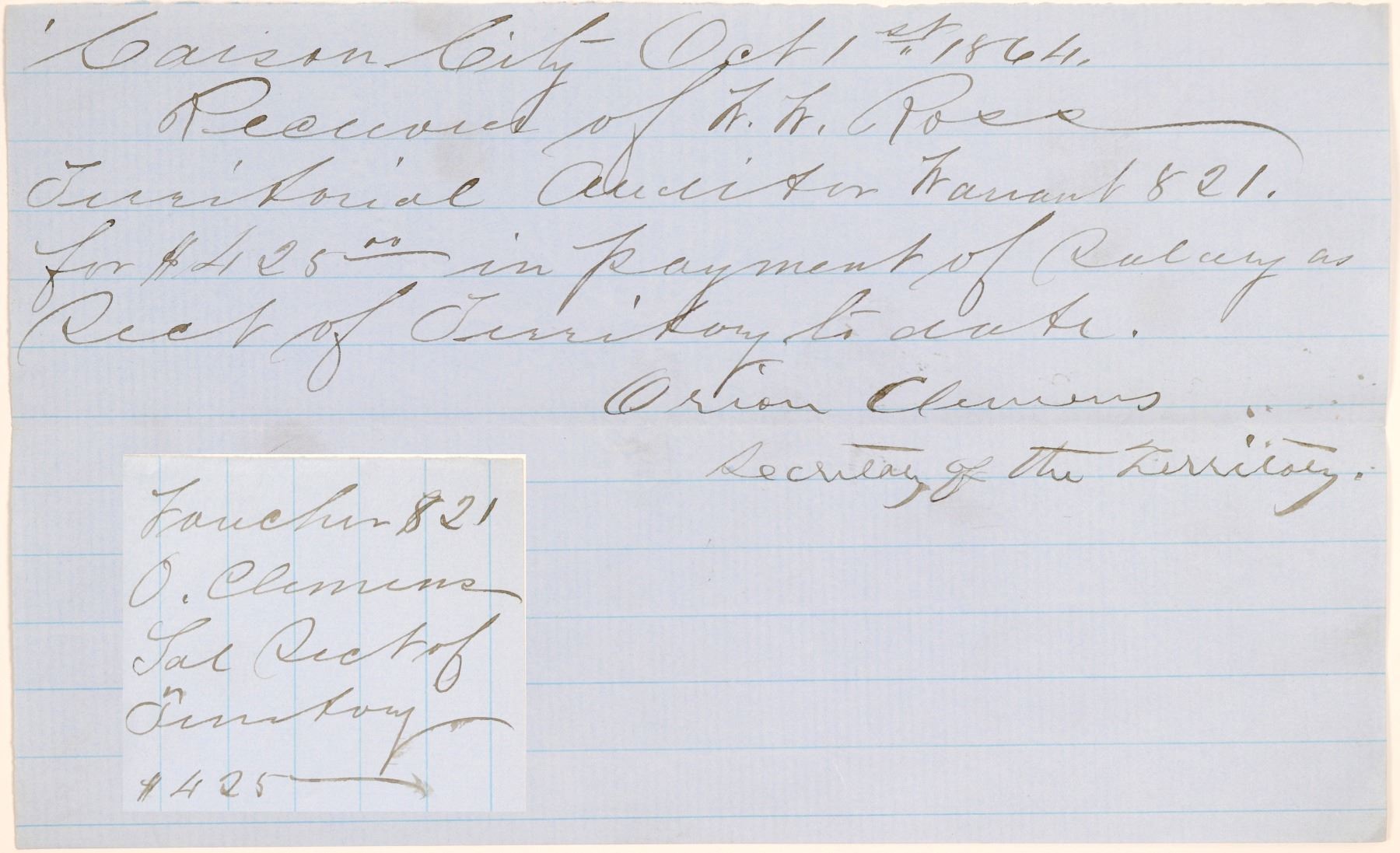 October 1, 1864. (Clemens' last month as Secretary of the Territory.)"Received of HH Rose Territorial Auditor warrant 1821 for $425.00 in payment of salary as rect. of Territory to date. Signed by Orion Clemens, Secretary of the Territory. Blue half sheet of paper. City: Carson City State: Nevada Date: 1864