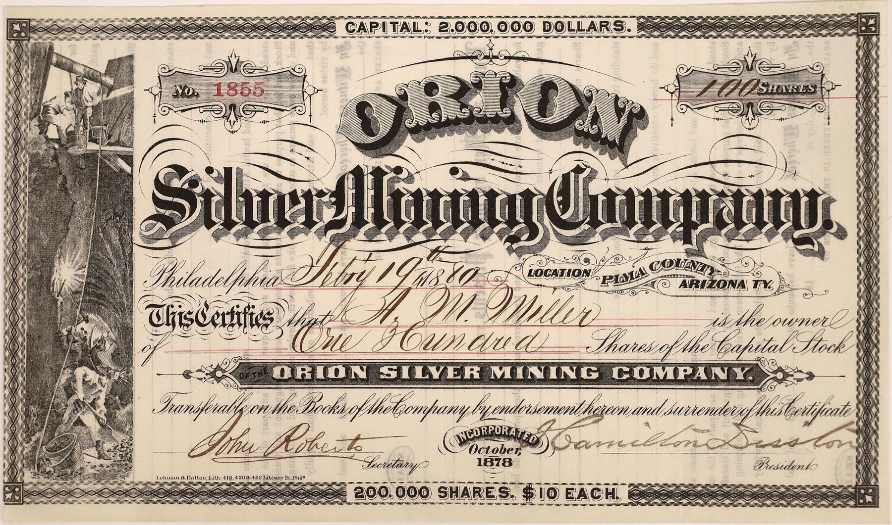 Certificate No. 1855 for 100 Shares dated Feb. 19, 1880 made out to A. M. Miller. Incorporated October 1878 and capitalized at $2,000,000; 200,000 shares at $10 per. Signed by President, Hamilton Sisston and Secretary John Roberts. Vignette of Miners hoisting ore at left. Printer Lehman & Bolton, Phila. Mine is in the Santa Rita and Patagonia mountains of Pima County. The Orion started with sharing offices with the Tombstone Gold & Silver Mill and Mining Company. The Tombstone people quickly moved to separate from the Orion which they did not think much of. The Orion property - as a matter of fact - they thought was a "no good mining property." [Tombstone, A. T.: A History of Early Mining, Milling, and Mayhem" by Shillingberg]
