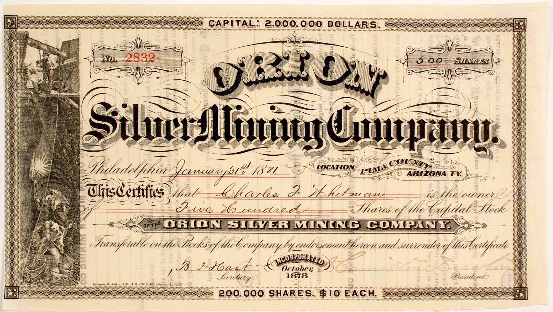 Number 2832 for 500 shares to Charles Whitman in 1881. Signed by BF Hart and Hamilton Distton. Cut unevenly, but no edge, corner, color or pinhole issues. The company had decent ores and built a mill which ran intermittently for lack of water. Disston as the son of a millionaire saw manufacturer in Philadelphia. He would make a dramatic purchase of 4,000,000 acres of Florida swampland for 25c and acre. He would turn this into buildable land. [Grabani] City: Pima, Oro Blanco State: Arizona Date: