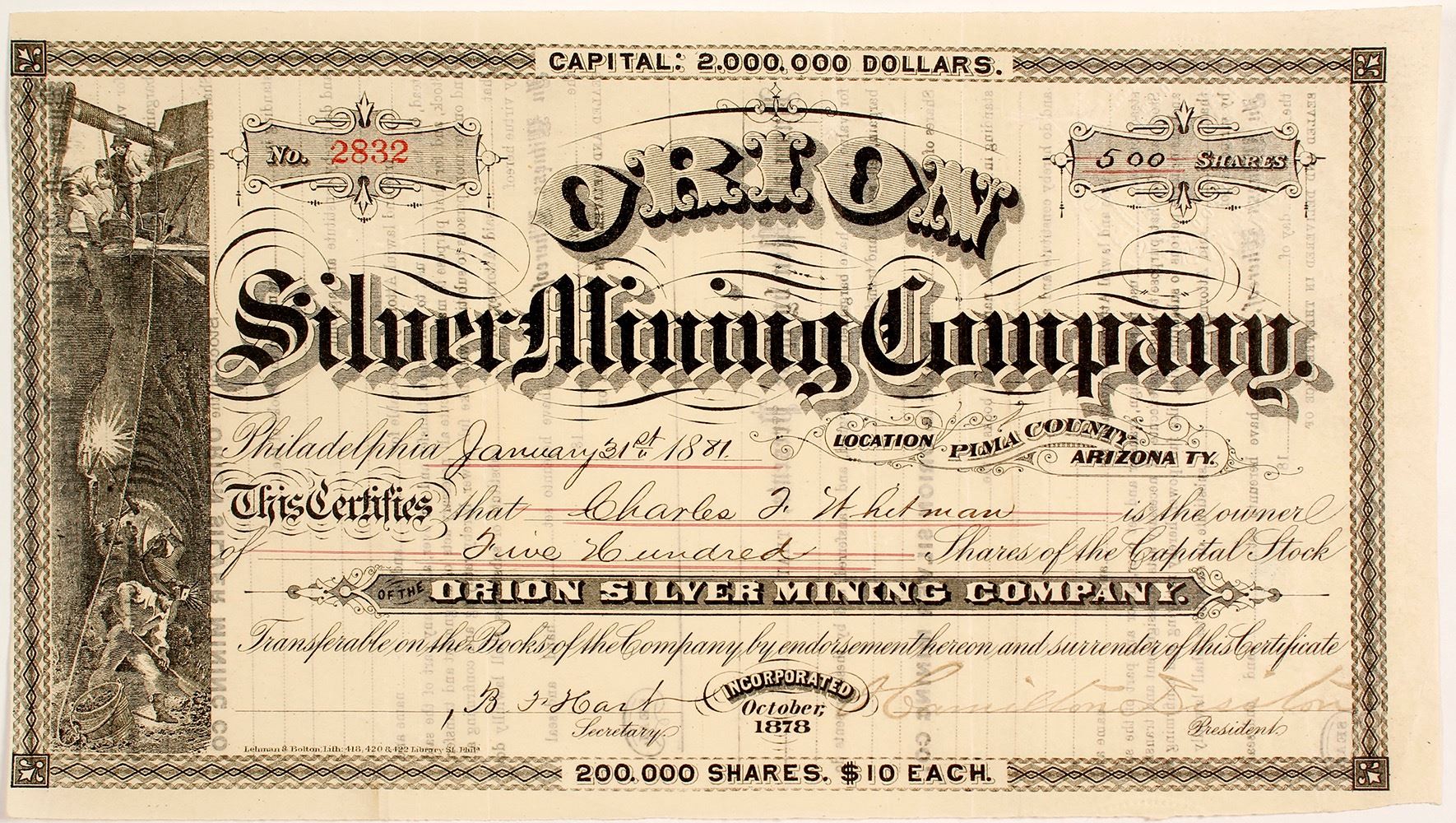 Number 2832 for 500 shares to Charles Whitman in 1881. Signed by BF Hart and Hamilton Distton. Cut unevenly, but no edge, corner, color or pinhole issues. The company had decent ores and built a mill which ran intermittently for lack of water. Disston as the son of a millionaire saw manufacturer in Philadelphia. He would make a dramatic purchase of 4,000,000 acres of Florida swampland for 25c and acre. He would turn this into buildable land. [Grabani] (Laguna Collection) HWAC# 63000 Date: Location: Pima, Oro Blanco, Arizona