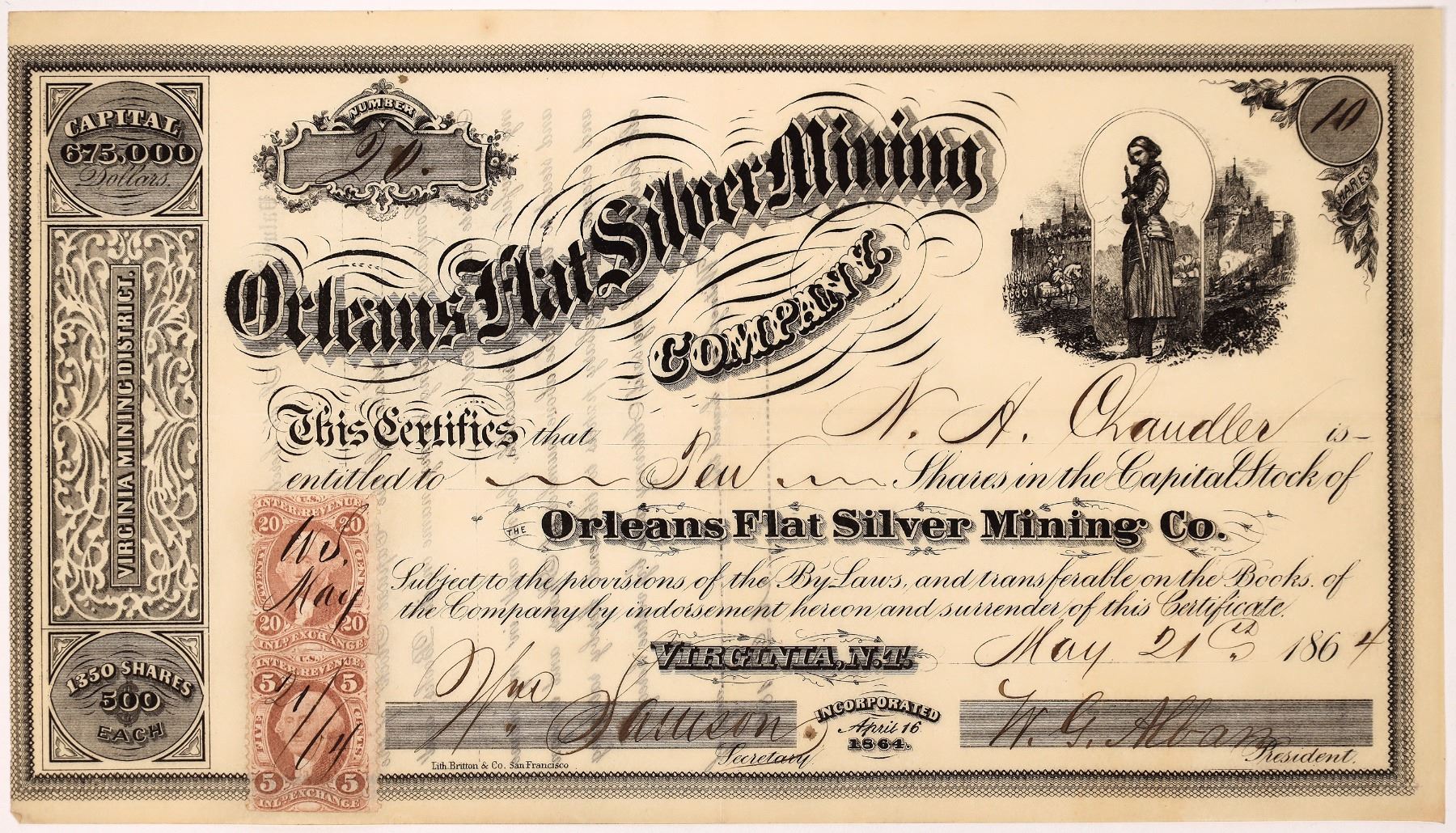 Orleans Flat Silver Mining Co. – Virginia Mining District - Virginia, N. T. – Certificate No. 20 for 10 shares dated May 21st, 1864, made out to W. H. Chandler. Incorporated April 16, 1864, and capitalized at $675,000; 1350 shares at $500 per. Signed by President, W. G. Alban and Secretary Wm. Samson. Vignette of Castle and knight with a sword in upper right. A 20 cent and a 5 cent Internal Revenue stamps Datelined Virginia, N. T. Printed by Britton & Co., S.F. Virginia City Nevada Franklin Collection