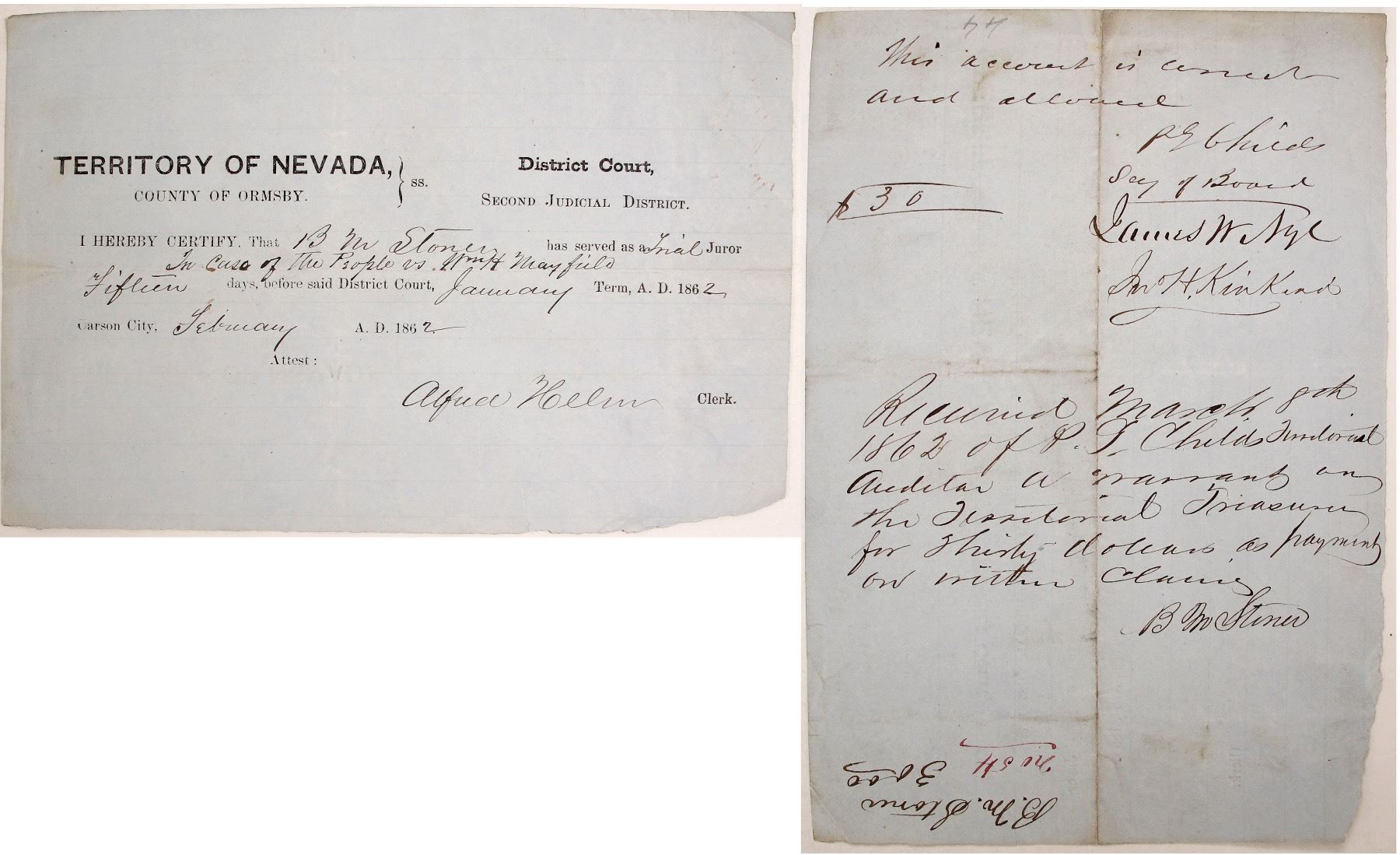 Territory of Nevada, County of Ormsby, District Court, Second Judicial District. Payment receipt to BW Stoner who served as trial juror in the case of the People vs. Wm. H. Mayfield, January 1862. Signed by the clerk, Alfred Heler. Blue paper. 5 x 7.5" Rough bottom edge. Date: 1862 City: Carson City State: Nevada HWAC# 77667