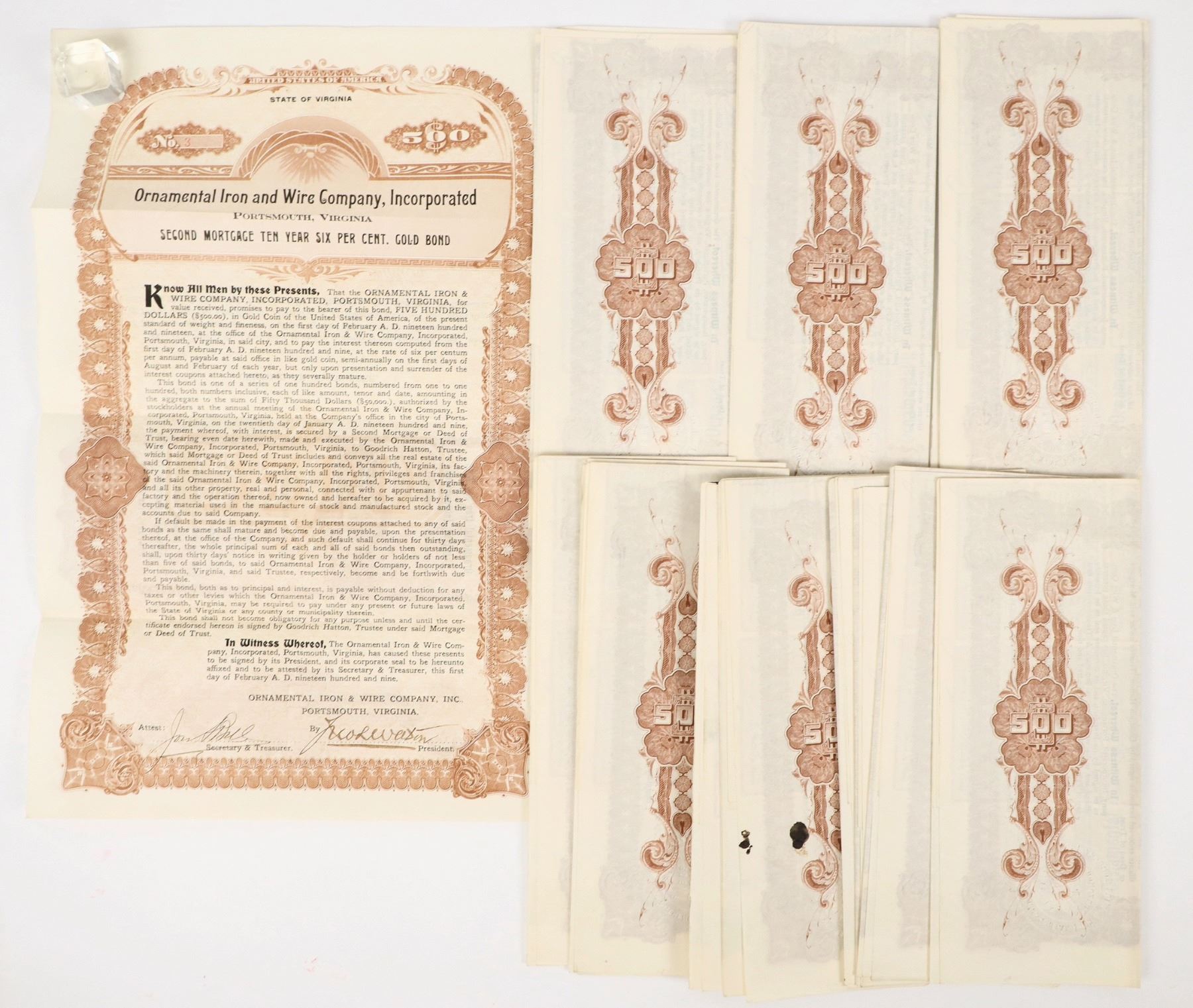 Lot of 15. I/U. Issued 1909. EF cond. Ornamental Iron And Wire Company, Inc, $500, 6% gold bearer bond with coupons.