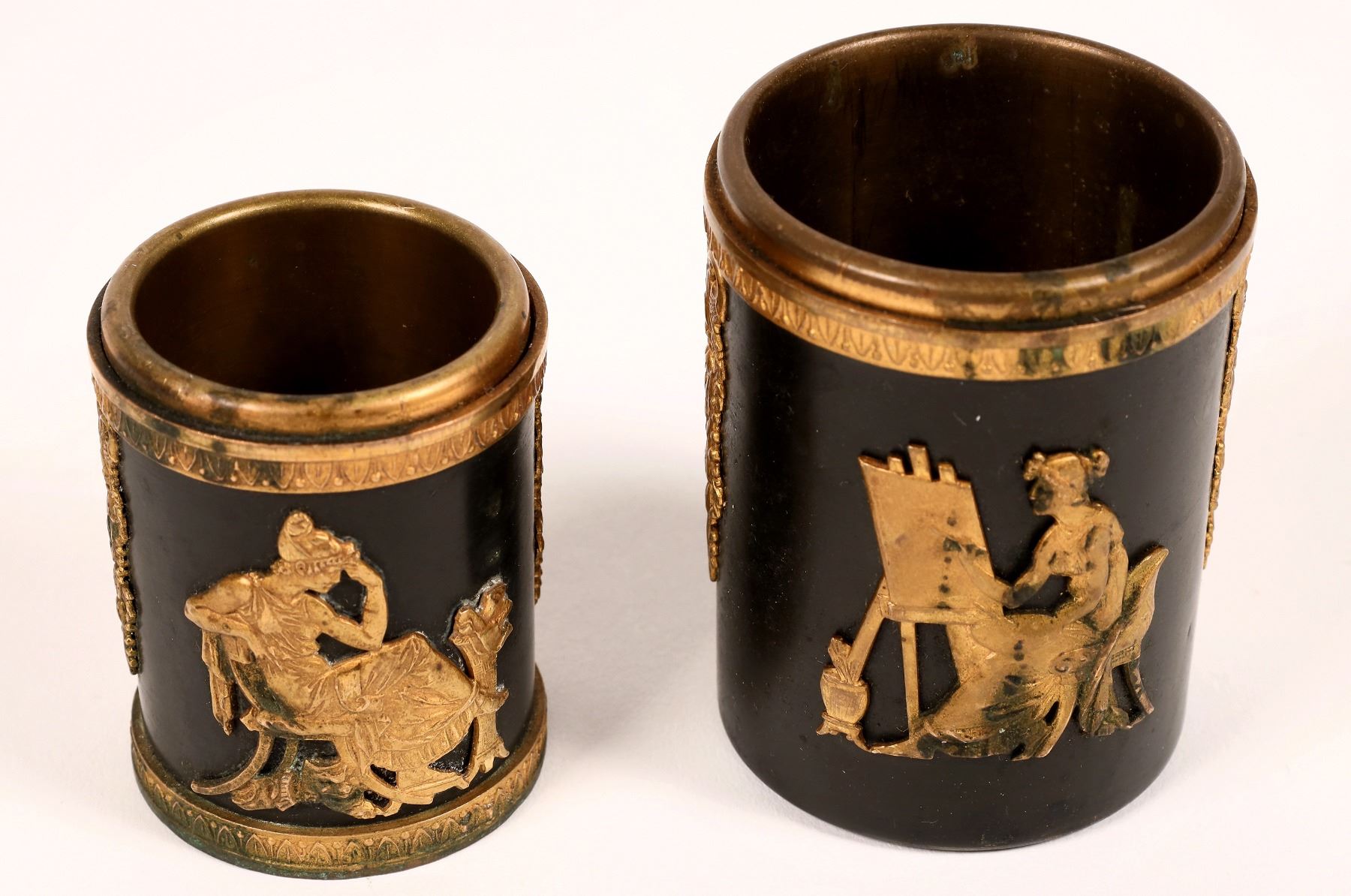 c. 1850's artist container for art quills, brushes, pencils etc. with sculptor and painter raised motifs. Brass on black lacquer, 2.5x2". c. 1850's gold plate on brass, gold mostly worn off, black lacquer base. Raised musician with a lute and and an introspective listener. 1 5/8x2". Nice set!