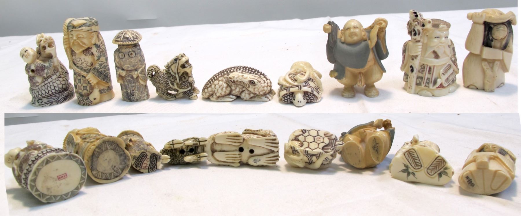 Eight finely carved and engraved figurines, 2-3". All appear antique, with carved and ornate flat bases with the signatures or markings of the maker on the base. Please inspect. State: City: Date: HWAC# 84844