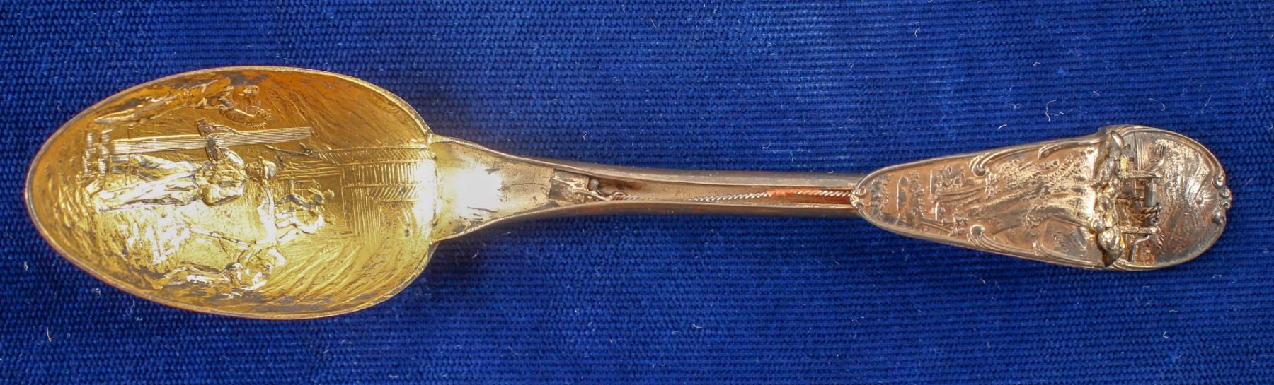 Spectacular silver mining spoon with windlass, chain and bucket on spoon shaft. Tiny gold nuggets on top, gold work under bottom engraving. Really distinctive and worthy of your collection. 5.5". Mackie Collection.