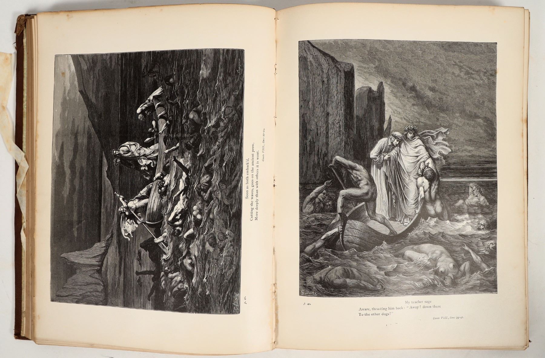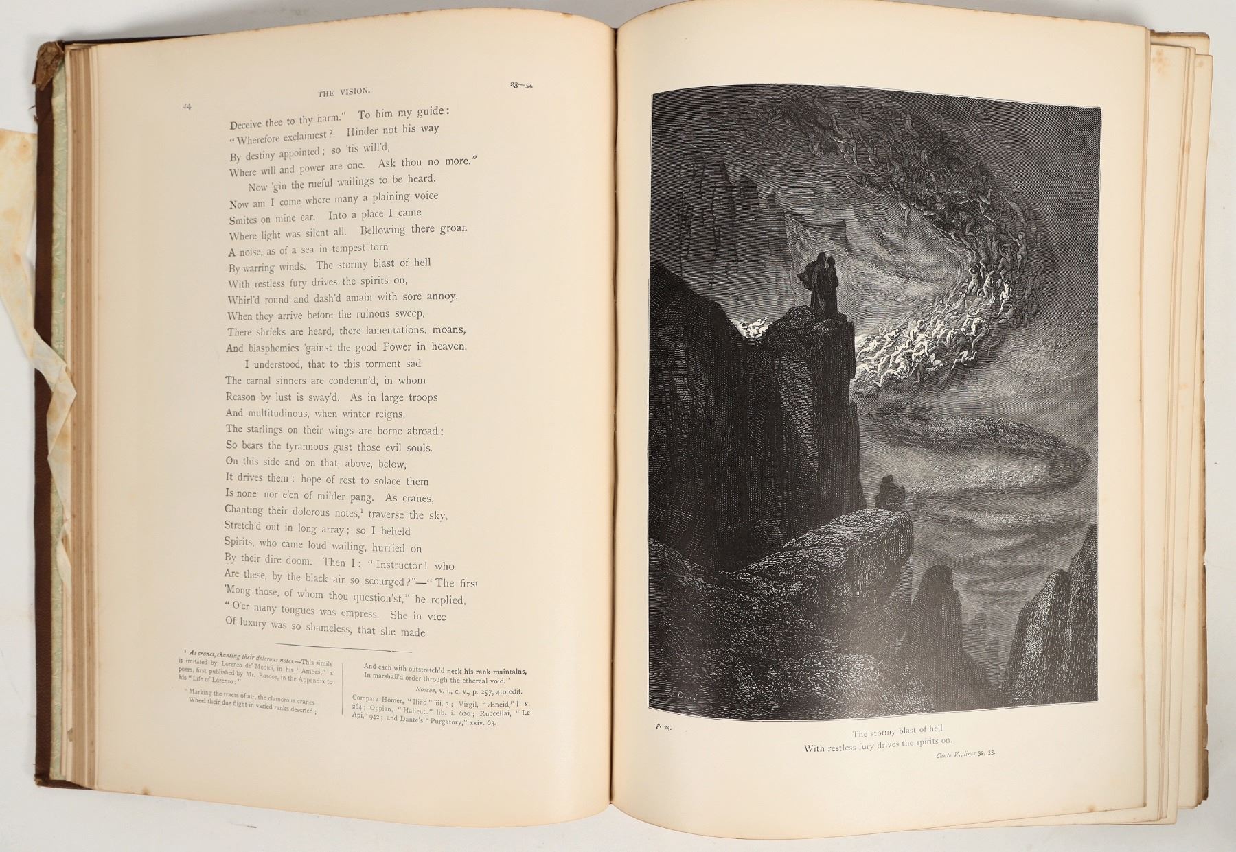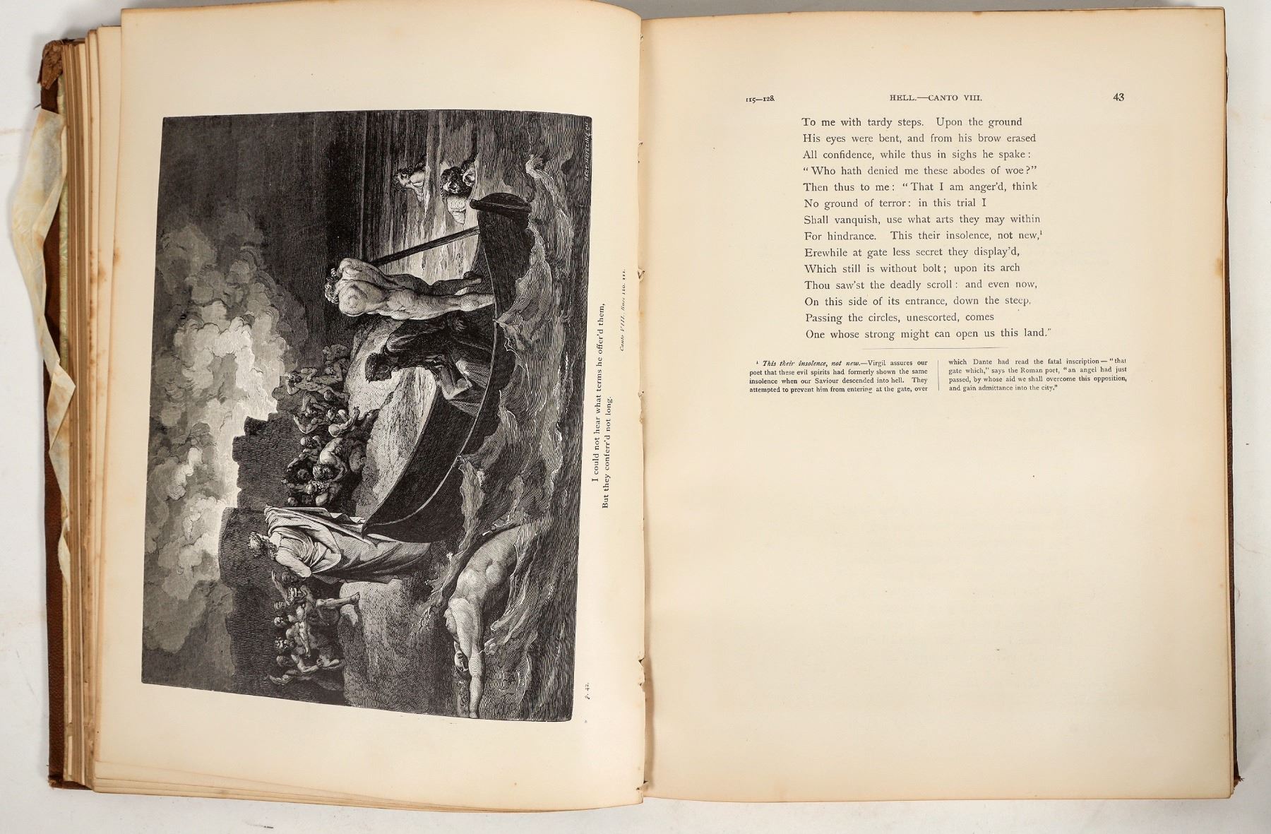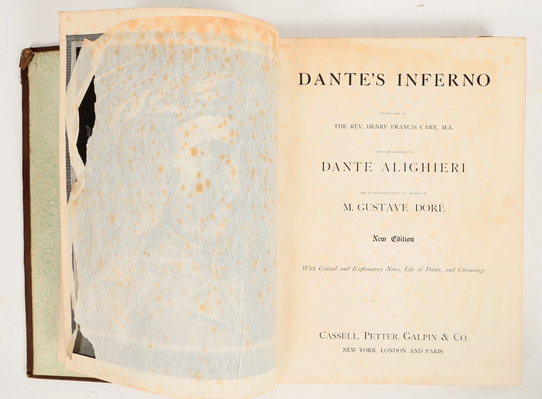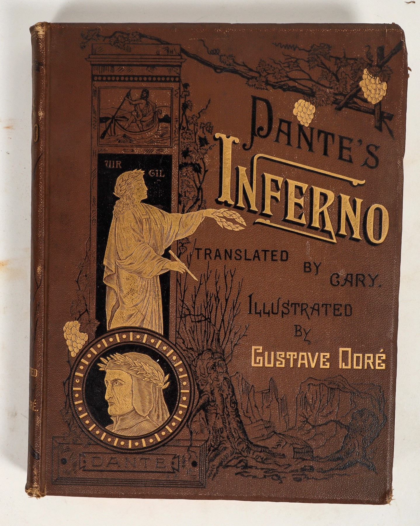 Elegant copy of Dante's inferno with gilded pages, golden illustration, and golden title text. Inscription on inner cover dates the copy to 1883. Pages show foxing and minimal toning. Spine intact. See photo.