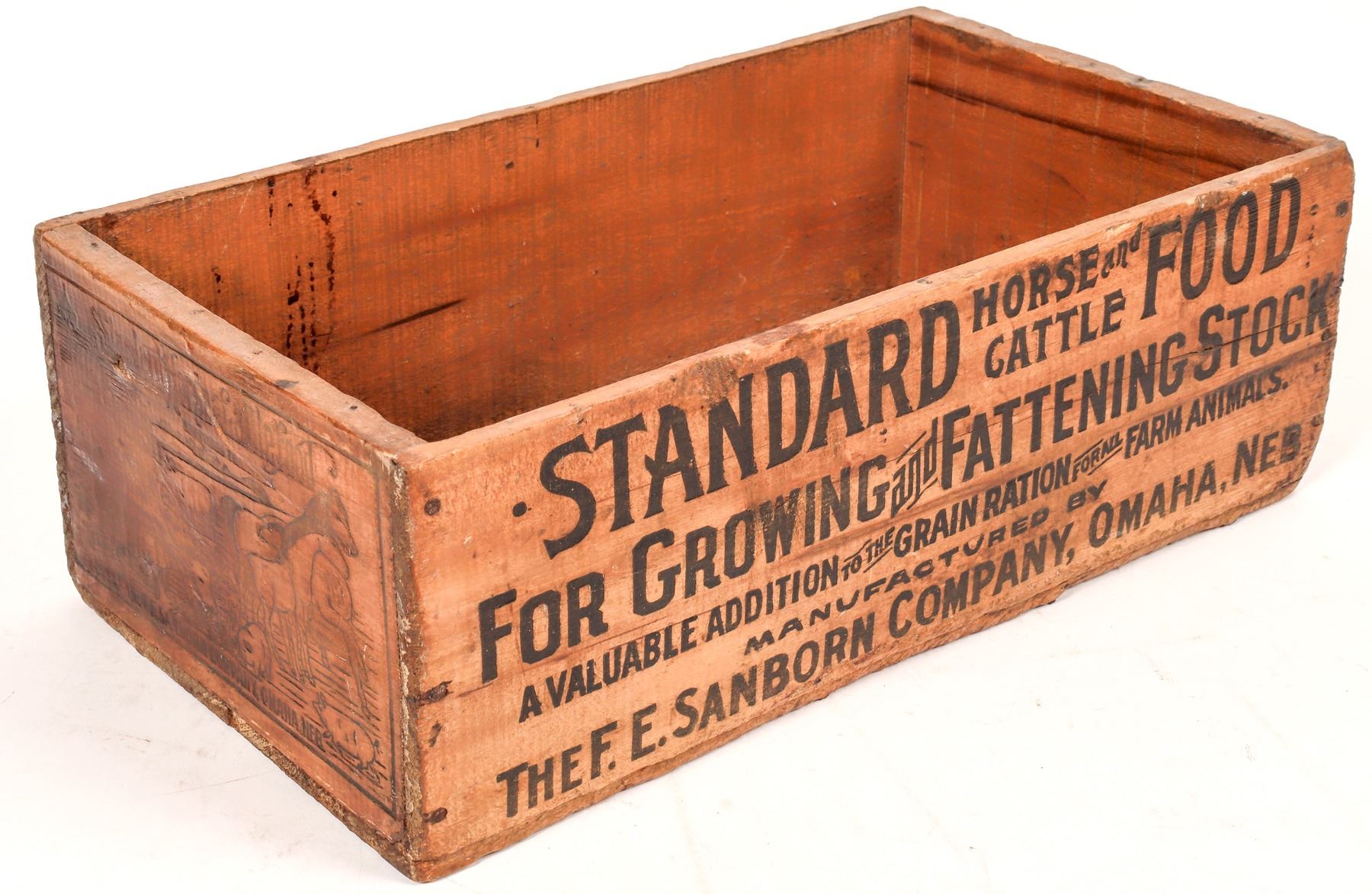 Ornate Standard Horse and Cattle Food rectangular wood box with fancy horse and cattle scene end panels. 6x18x10". Nebraska Omaha Gary Bracken Collection