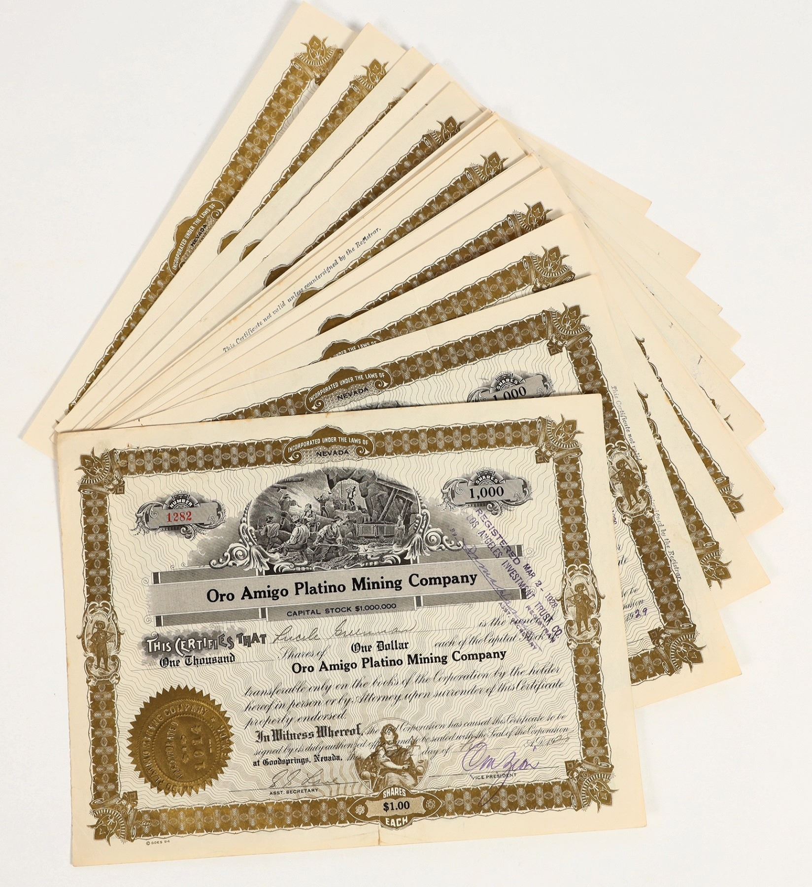 About 25 Oro Amigo Platino Mining Company Stocks c. 1929-32. This mining company issued stocks certificates during the Goodsprings mining boom in Nevada. See photos.