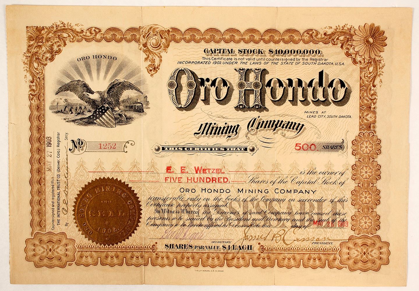 Inc. in South Dakota. No. 1252, issued for 500 shares to E.E. Wetzel on May 25, 1903. Signed by the president and secretary. Not cancelled. Brown border and background, black print. Vignette of eagle clutching stars and stripes shield. Deep folds with some separation, some toning. 8.25 x 11.75" A 1,000 acre claim that adjoined the Homestake property. In 1902, they had a 3 compartment shaft on the Comstock claim. (Al Adams Gold Rush Memorabilia Collection) Date: Location: Lead City, South Dakota HWAC# 59057