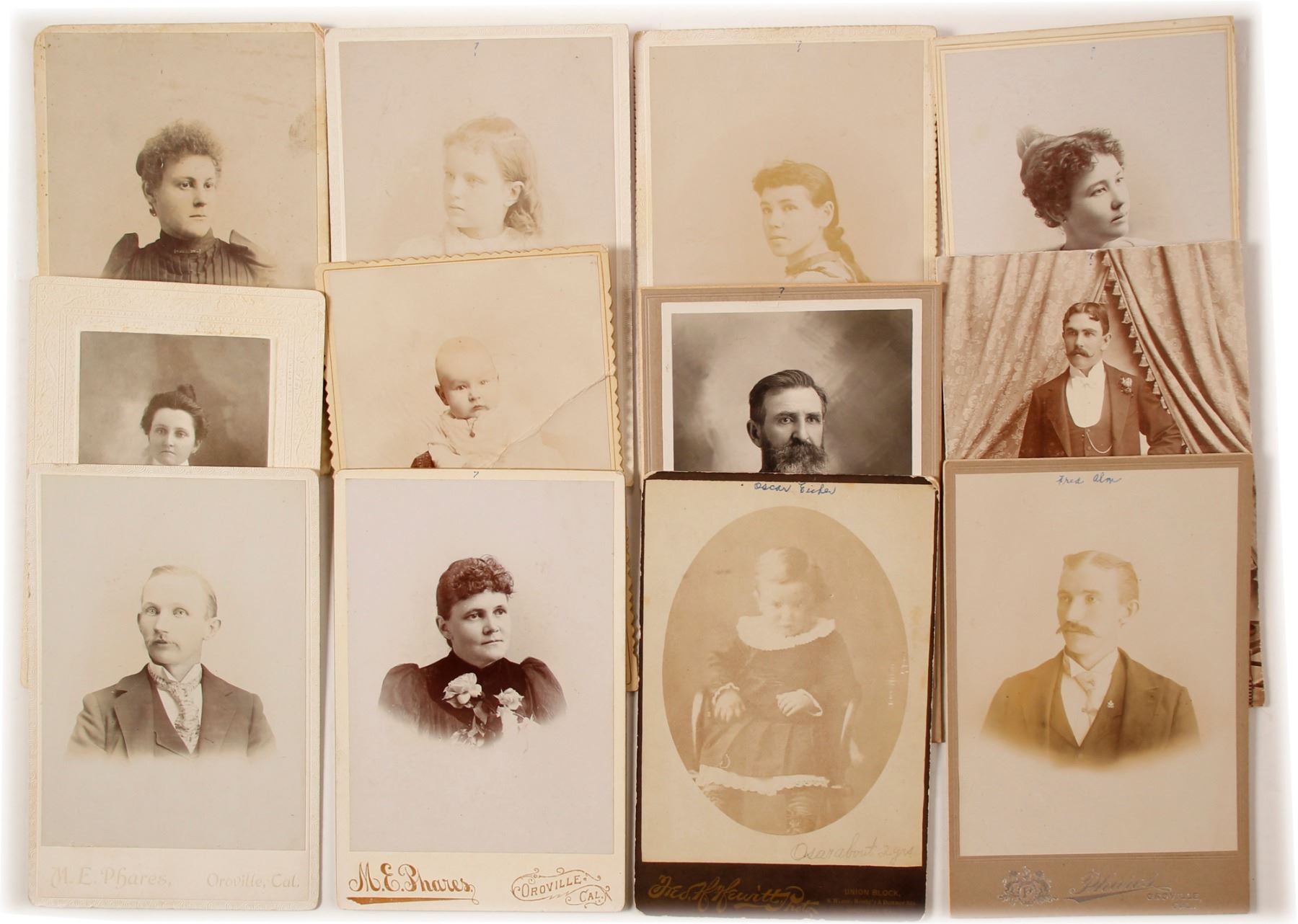 12 Cabinet cards from Oroville, California (photographer M.E. Phares) Cabinet card of Jessie May Eicher; Cabinet card of Jessie Boswell; Oscar Eicher (2 years old); Fred Alm; Charles Alm (killed in Boer War) From the Salvatore Falcone.