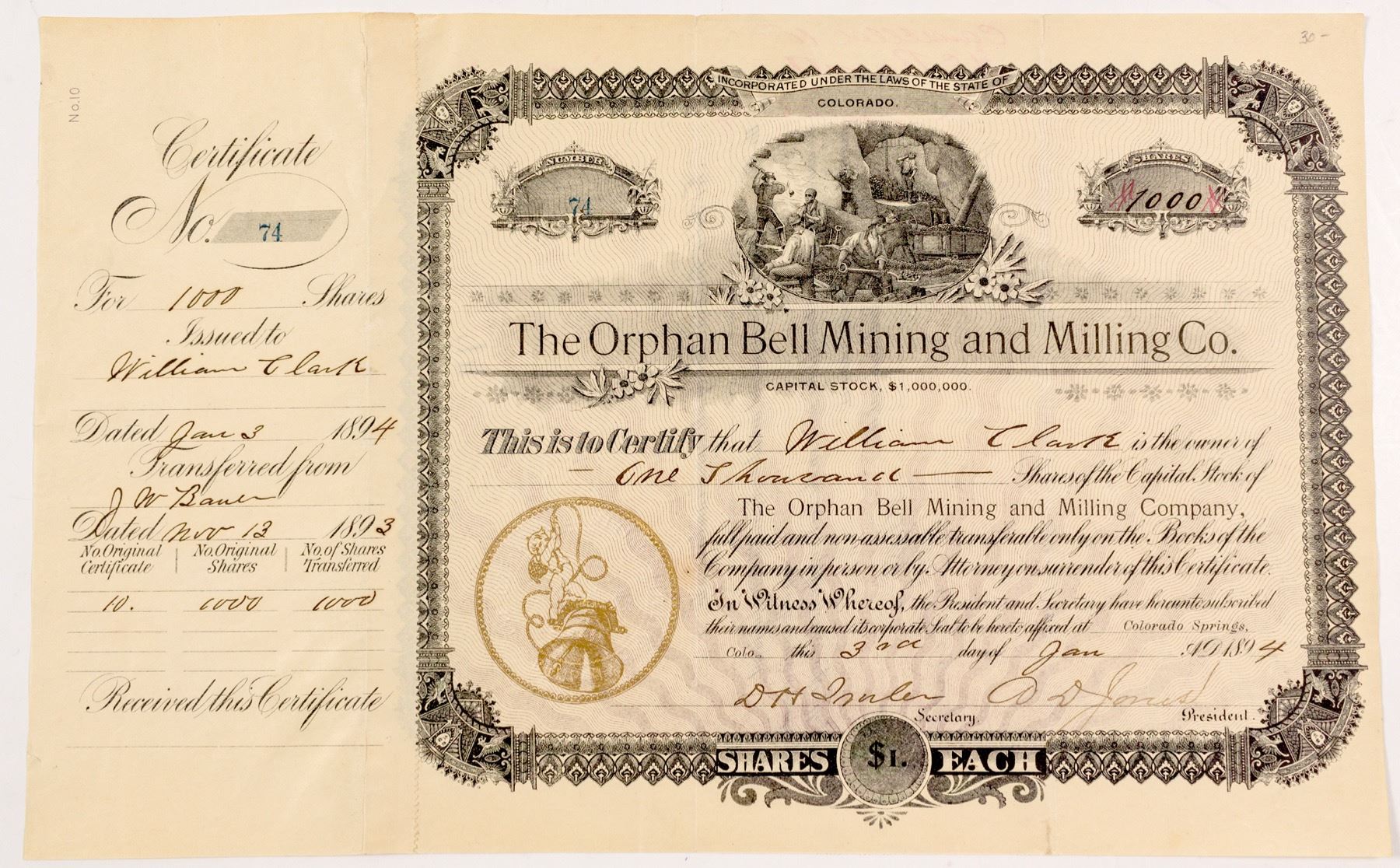 Number 74 for 1,000 shares to WIlliam Clark in 1894. Signed by secretary DH Imler and president AD Jones. Certificate receipt is attached. Gilt circle logo with a cowgirl roping (very unusual) over seal. Two vertical folds. Fantastic condition: no rips, tears, edge issue holes. 13 x 8.5". State: Colorado City: Cripple Creek Date: 1894 Al Adams Collection. HWAC# 55072