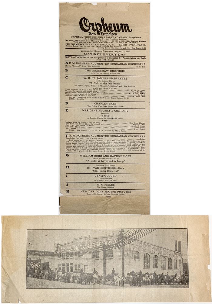 Newspaper ad for the Orpheum Theatre in San Francisco: E. M. rosner's Augmented Hungarian Orchestra, The Bradshaw Brothers, W. H. St. James and Players, etc.