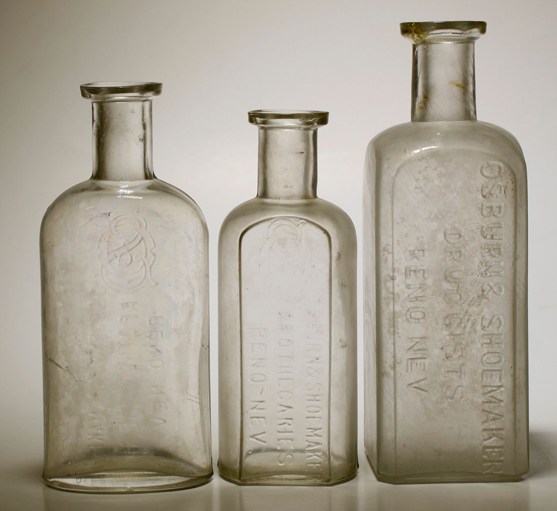 Item #1 of 3: Monogram: O & S at shoulder/ Osburn & Shoemaker / Apothecaries / Reno, Nev. // Base embossed : W.T. Co. / Pat Jan / 1878 // Clear, Millville round. 4 7/8" tall, tooled top. Perfect condition, except for light haze ( 1880-1889). Item #2 of 3 : Osburn & Shoemaker / Druggist/ Reno , Nev // Base embossed :" GW". laying on the left side. Clear, square, with heavy stain, and a lip repair. 5 3/4" tall, tooled top. very rare, with " GW" on base. Item # 3 of 3: Monogram: O & S at Shoulder / Osburn & Shoemaker / Apothecaries / Reno , Nev. // Clear,Penn oval.5 " tall, tooled top. Base: W.T. Co. ( Embossed, upside down !! ) // Good condition , except for some light haze, and a small scratch, in the body area. Nice grouping of bottles ( RH). State: Nevada City: Reno Date: 1878-1889 HWAC# 61162
