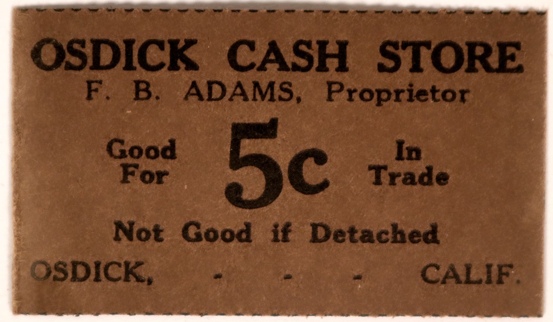 Rare brown cardboard token from the Osdick Cash Store / F. B. Adams, Proprietor / Good For / 5c / In Trade / Not Good if Detached / Osdick - Calif. 2 x 1 inches. Ex.: Ron Lerch Collection.