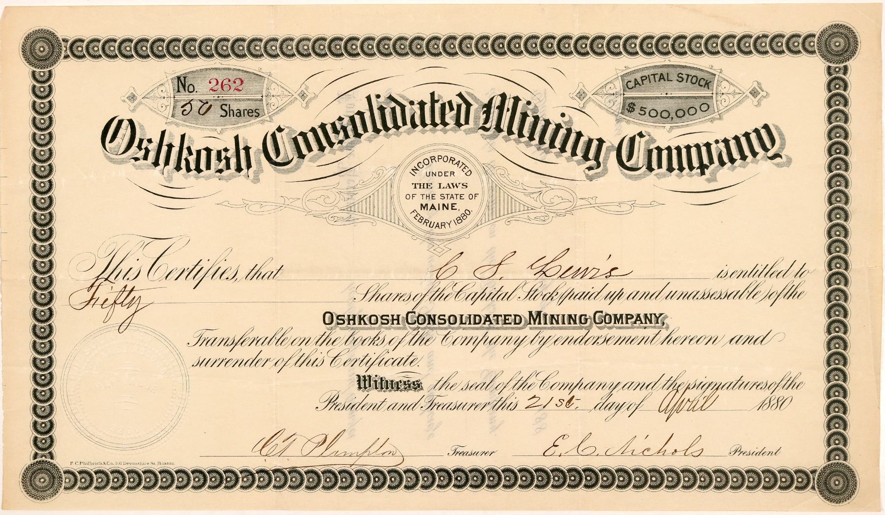 Inc. in Maine, Feb. 1880. No. 262, issued for 50 shares to CS Lewis on April 21st, 1880. Signed by president E.C. Nichols and treasurer CT Plimpton. Not cancelled. Fancy border and black print, no vignette. Printed by FC Philbrick & Co., Boston. Folds, bends. 6.25 x 10.75" Not listed in Fossett or C&L. According to a Feb. 4, 1880 Boston Globe article, the company formed to mine at Lawson, Colorado which is located in Clear Creek County. A March 7th, 1880 Boston Globe article pinpoints it further as being in the Montana Mining District. Ken Prag Collection