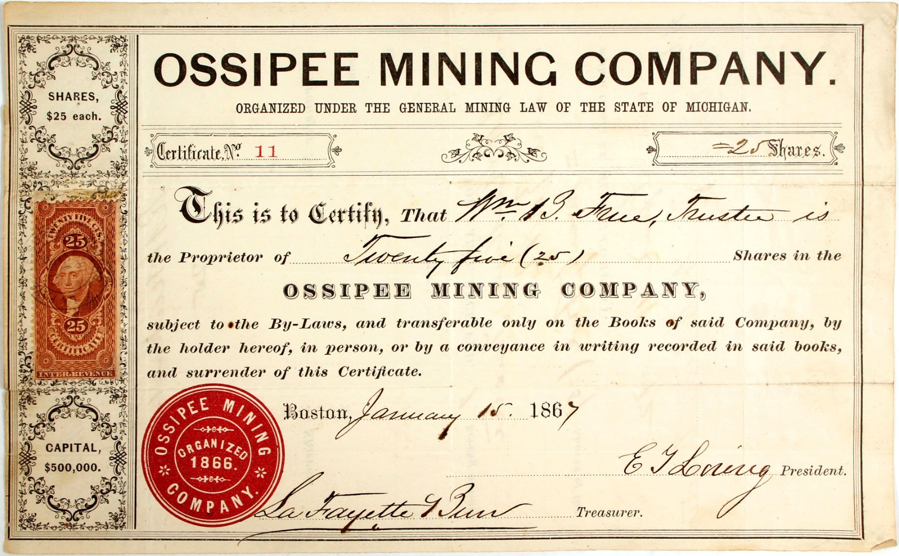 I/U #11 Wm Fruce? 25 shares 1867. 25c revenue stamp. Signed by President Loring. R5, multiple folds, .5" tear. Prag Collection. State: Michigan City: Date: 1867 HWAC# 82562