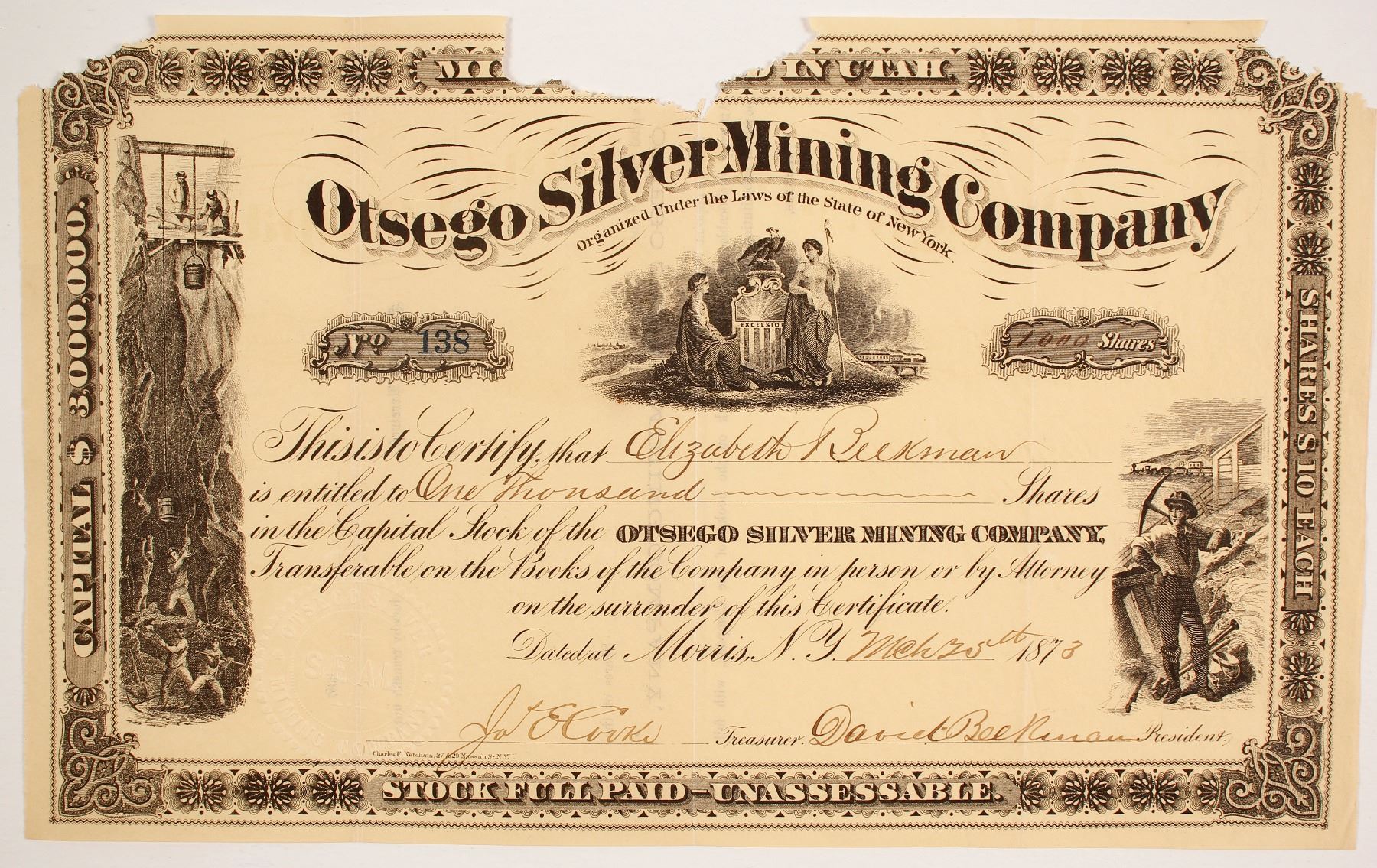# 138 for 1000 shares to Elizabeth Beekman. Signed by James Cook and David Beekman. Dateline New York 1873. Three allegorical and mining vignettes. Not cancelled. "The Otsego Silver Mining Company owning the Gold Hill, May Flower and Tessora mines has shipped about 1,000 tons of ore to the Tintic Mill and Mining Company's mill up to January 1 1874, The shaft on the May Flower is 130 feet deep and three levels respectively 75, 25 and 35 feet long have been run from it. The May Flower tunnel, connecting with the Gold Hill shaft, which is down 90 feet is 316 feet in length near the end of which is sunk May Flower shaft No 2, to a depth of 30 feet. The Tessora has a shaft sunk on it to a depth of 140 feet with drifts running in opposite directions on the vein." [Statistics of Mines and Mining in the States and Territories West, 1874] Great mine with serious condition issues (please see photo). Ken Prag Collection