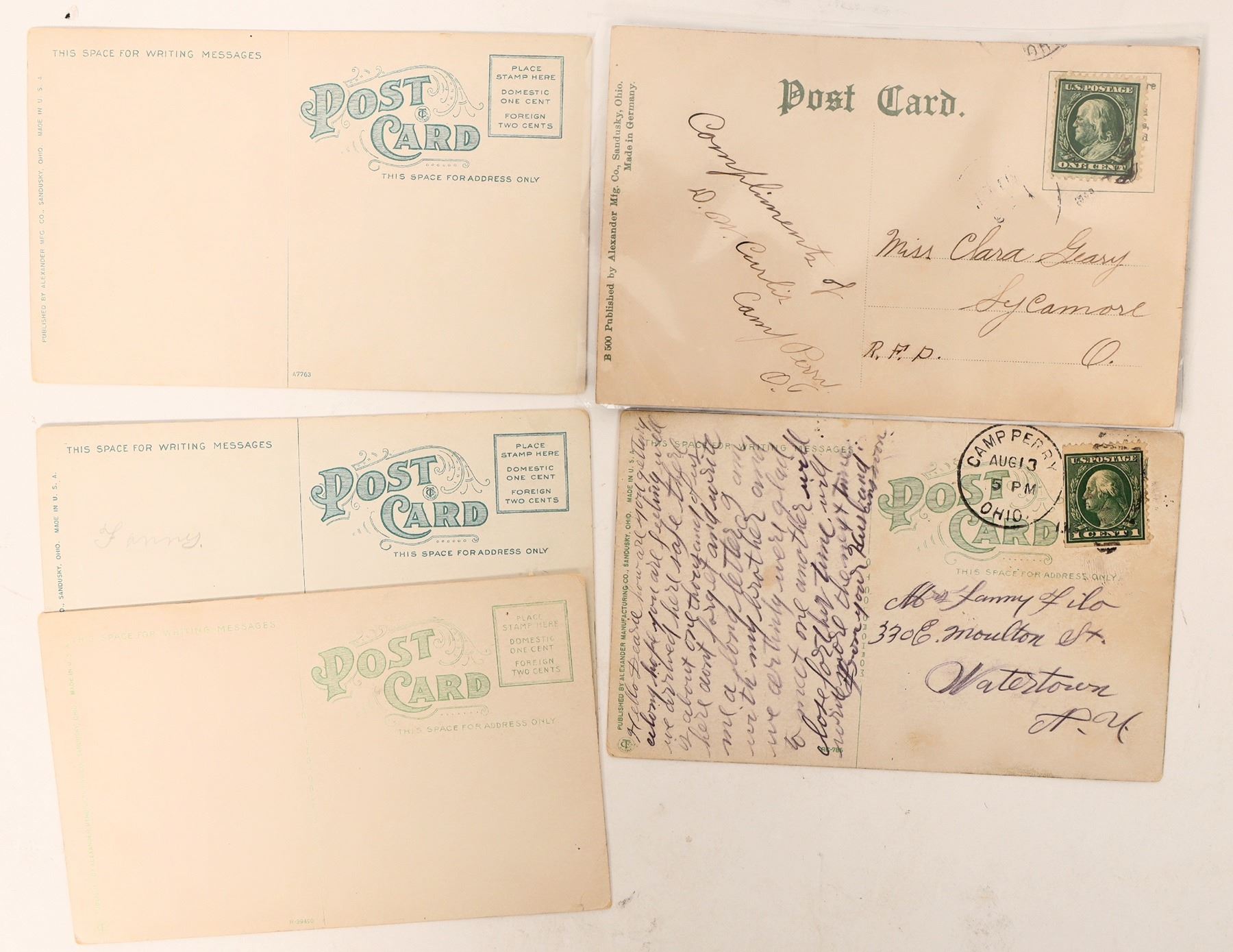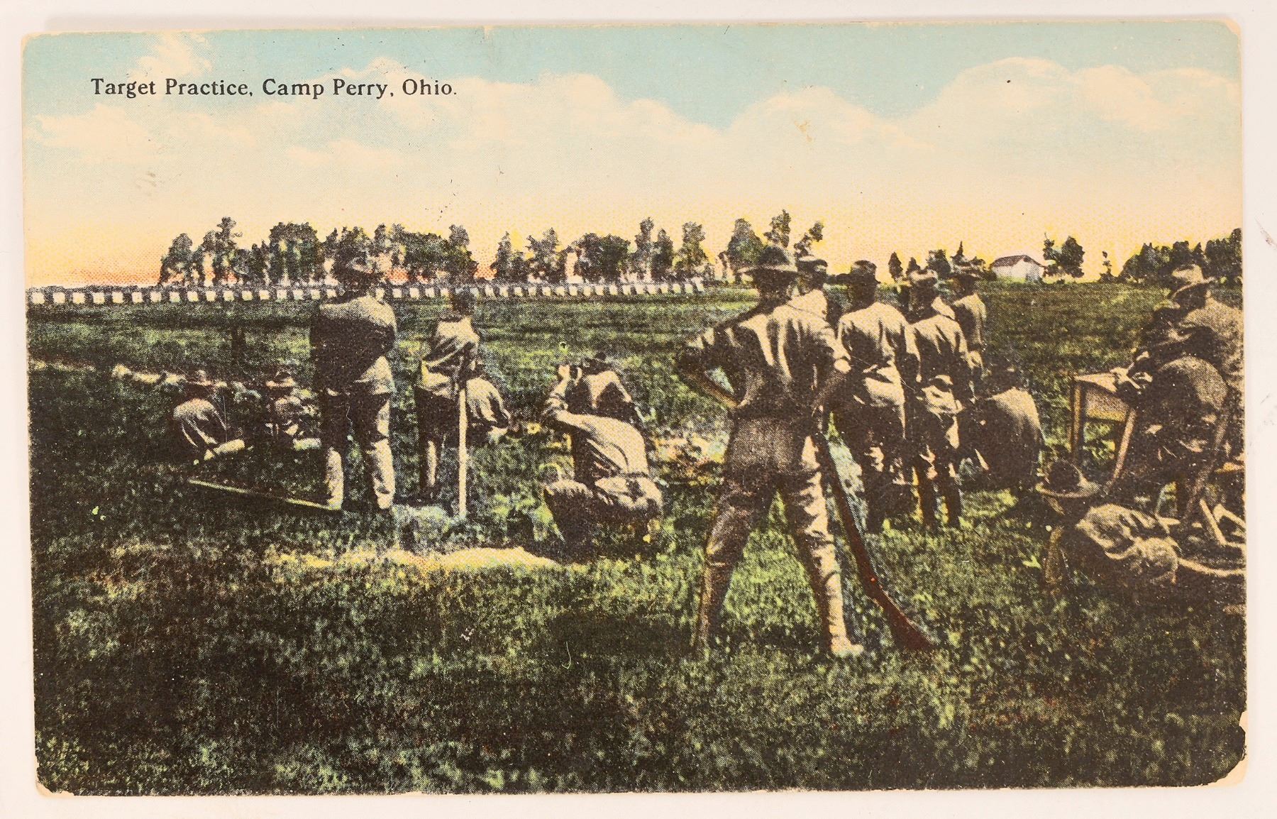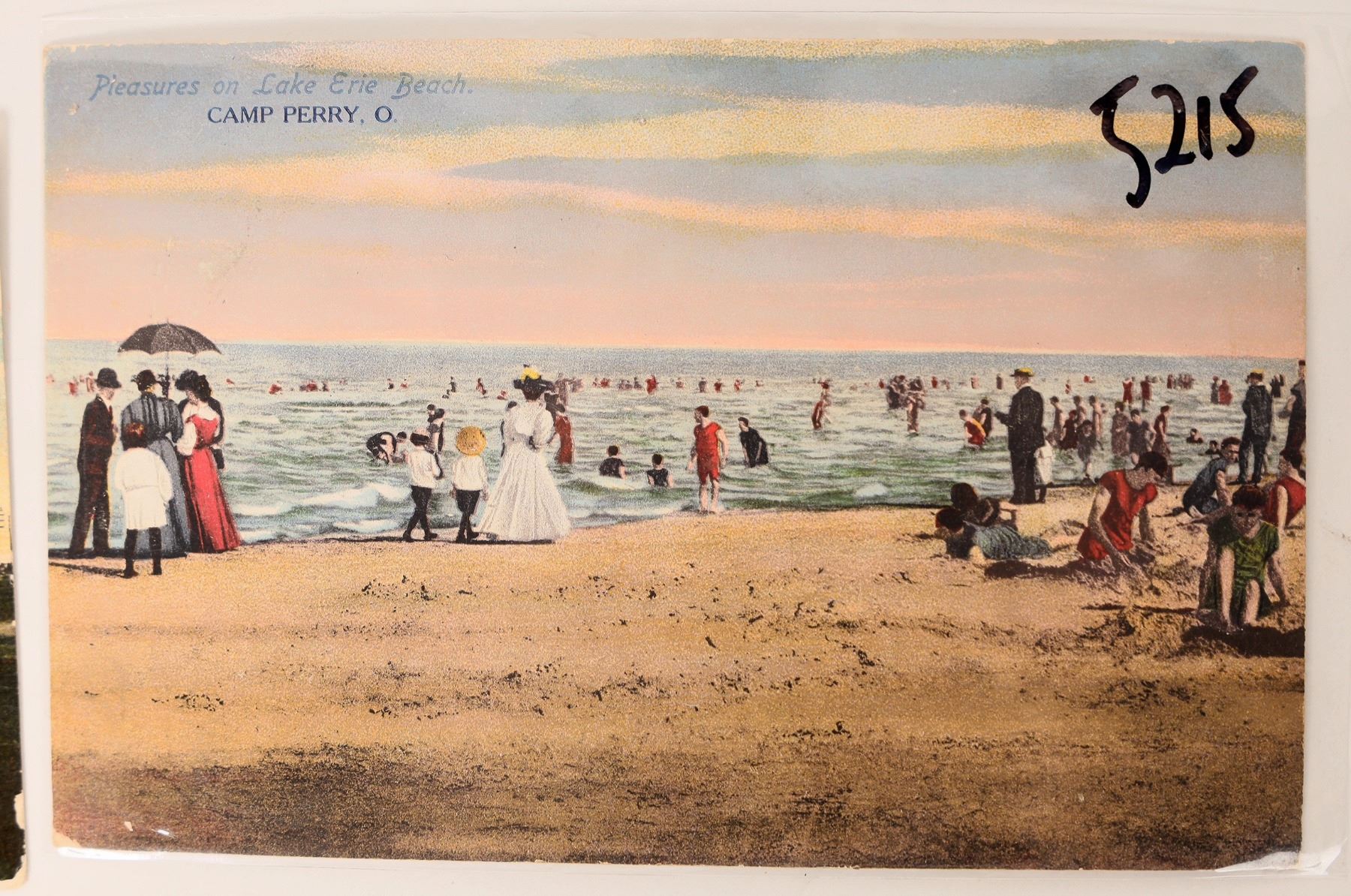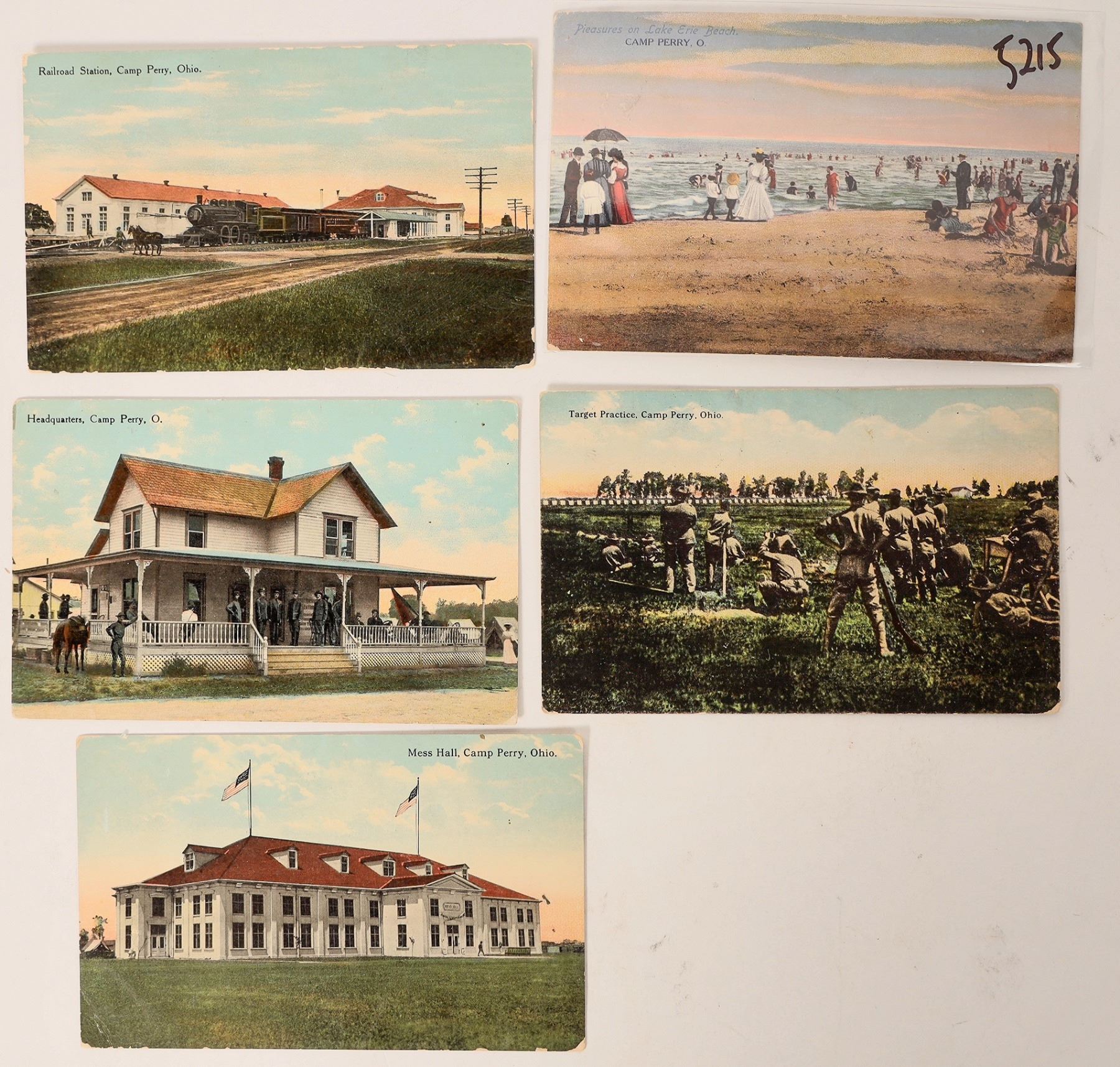 A group of 5 postcards featuring Camp Perry, Ohio, Ottawa Co, c1909-13. Lake Erie Beach, camp headquarters, RR station, mess hall, target practice.[ Camp Perry Ohio